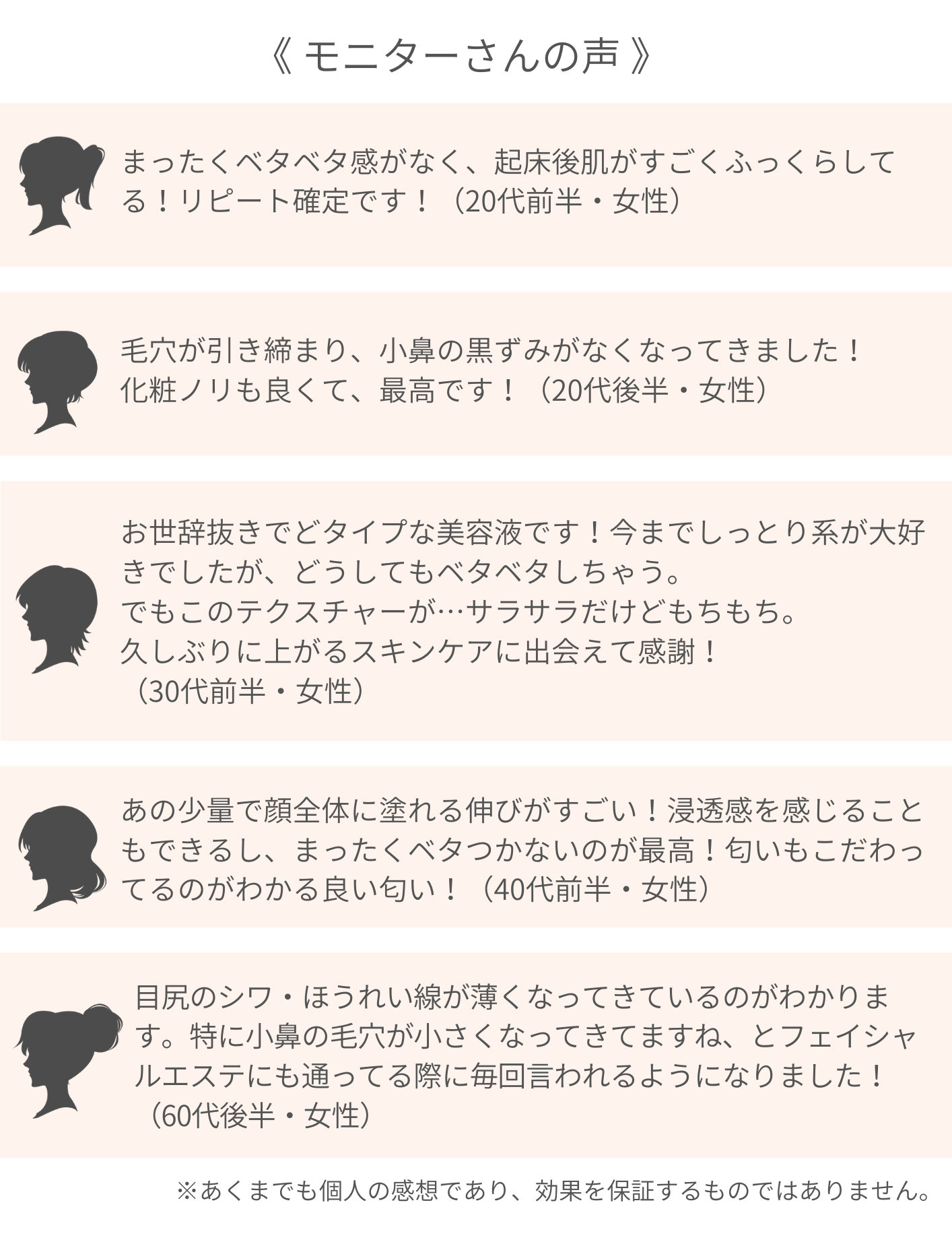 ご使用方法:美容液を1プッシュ手のひらに取り出します。洗顔後、お顔全体をやさしく包み込むように馴染ませていきます。特に気になる部分には、重ねづけをおすすめします。その後はいつものお手入れをしてください。