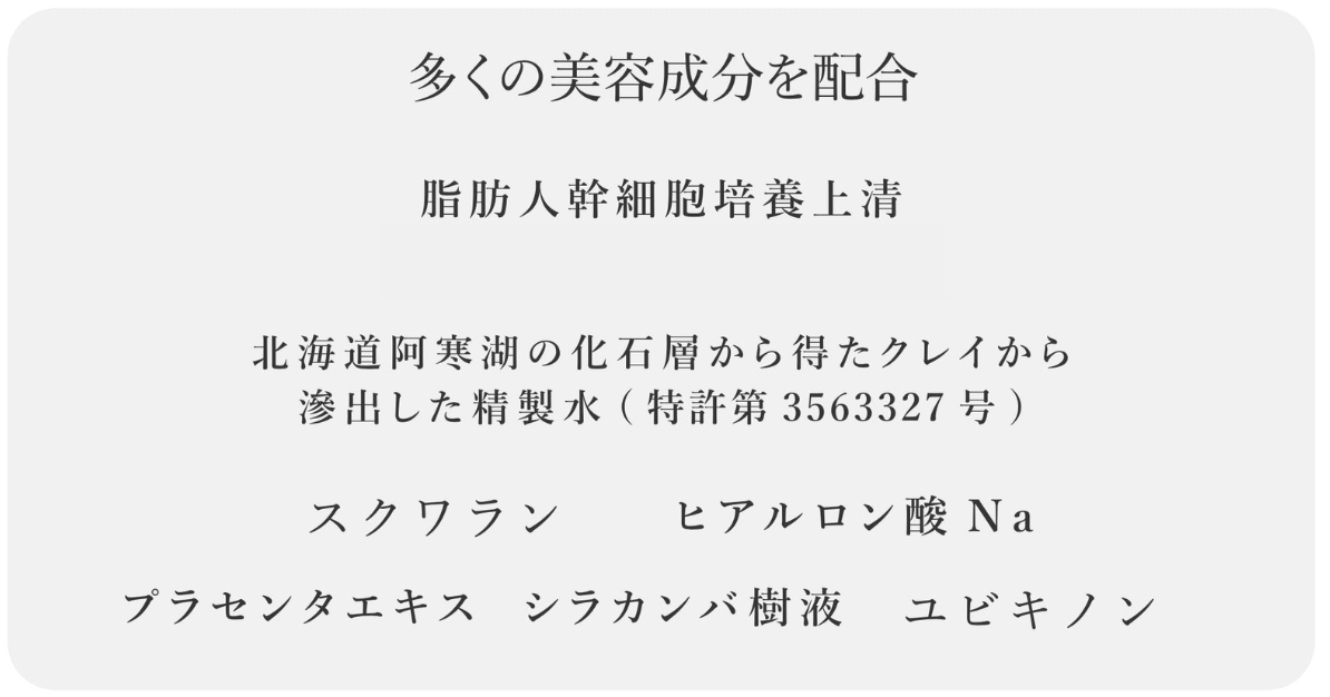 配合成分:水、グリセリン、BG、シラカンバ樹液、スクワラン、(アクリル酸ヒドロキシエチル/アクリロイルジメチルタウリンNa)コポリマー、ヒト脂肪由来幹細胞順化培養液、プラセンタエキス、カミツレ花エキス、ヒアルロン酸Na、ユビキノン、アラントイン、グリチルリチン酸2K、ダマスクバラ花油、ポリソルベート60、エチルヘキシルグリセリン、1,2-ヘキサンジオール、フェノキシエタノール