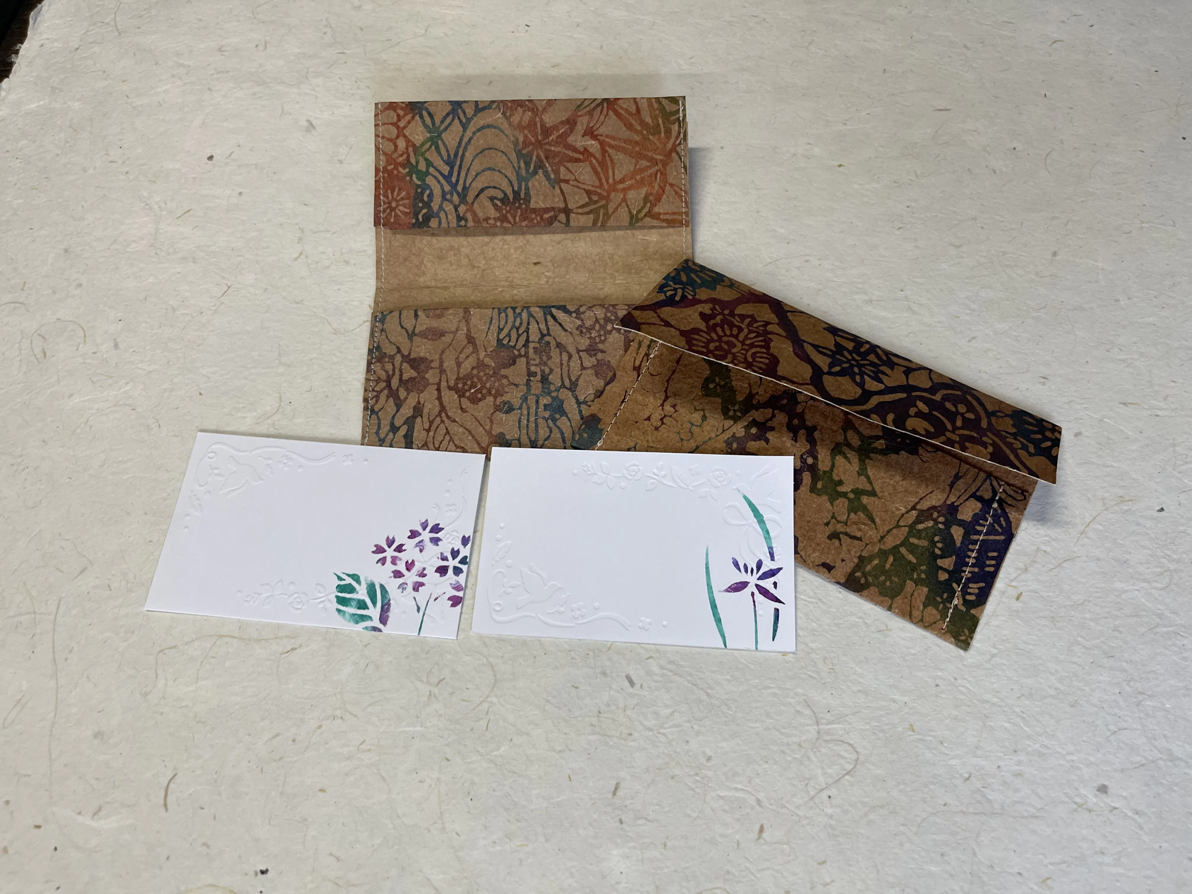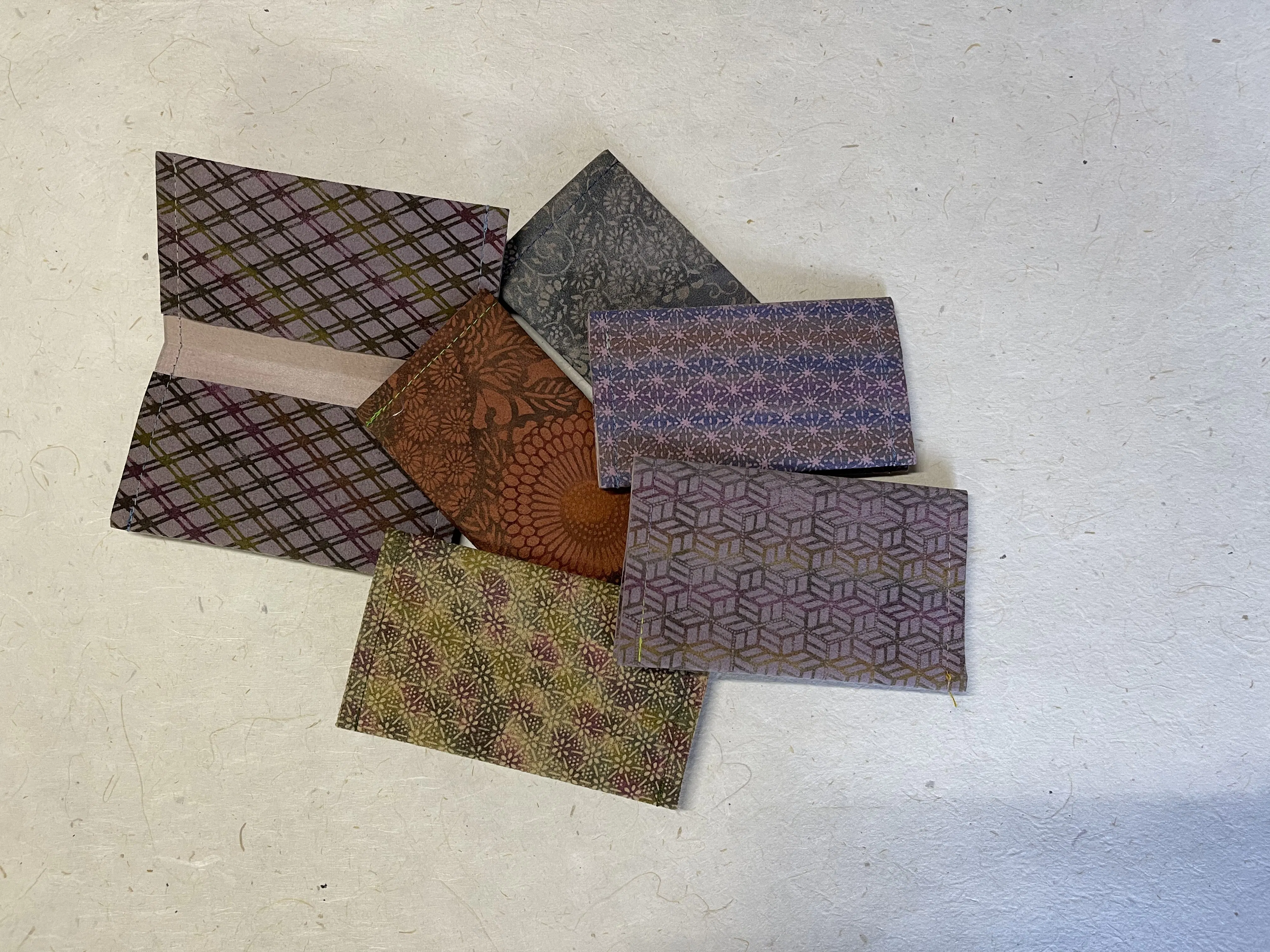 手漉き和紙に型染めを施した「竹和紙カードケース」。竹は八王子産、和紙は昔ながらの手漉き技法。染めは手差し型染、機械を一切使わず、刷毛で色を差していき工程が何度も繰り返されます。