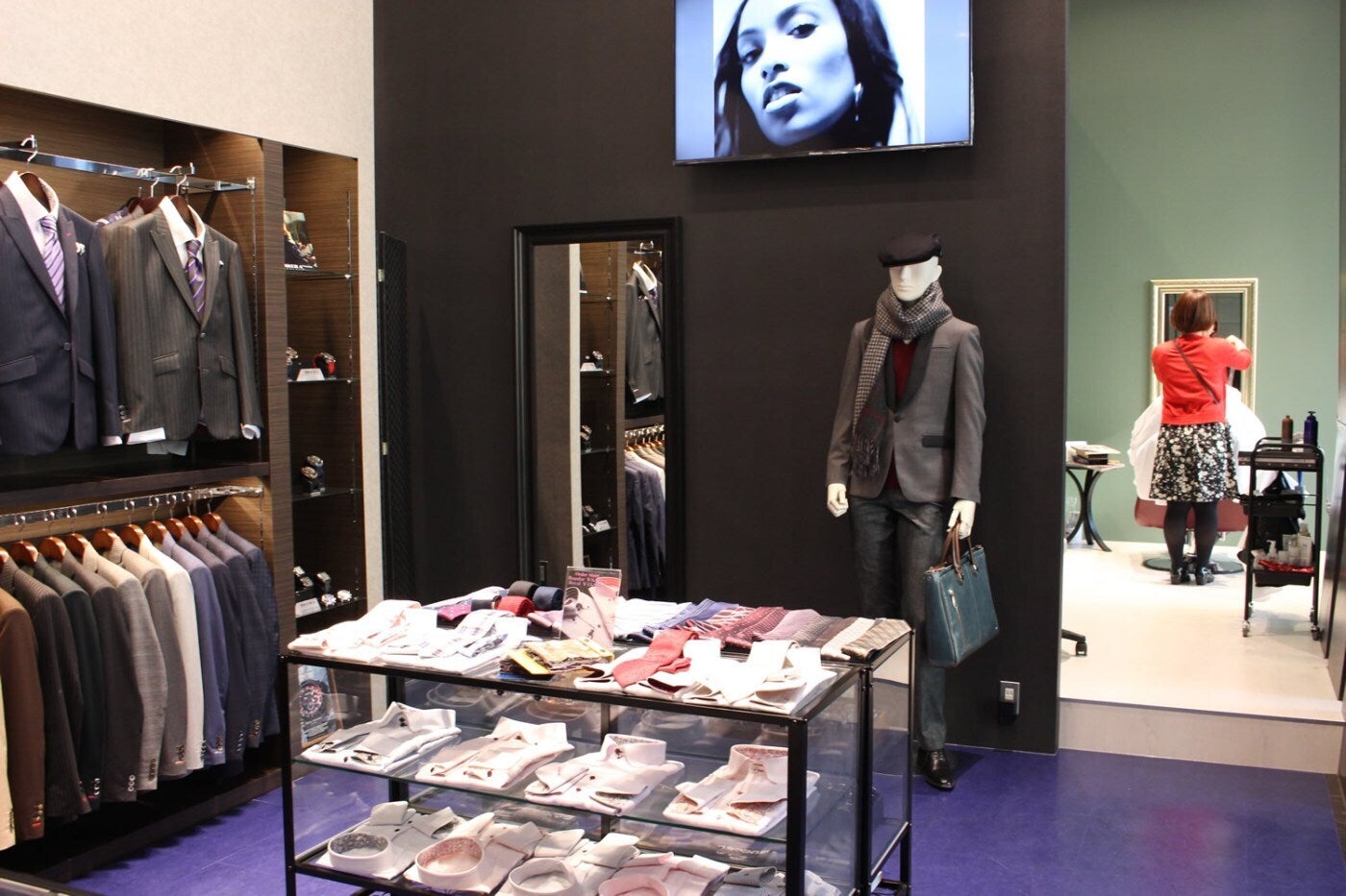 オーダースーツ店内に美容院が併設した新しいコンセプトのプライベートサロン【オーダースーツ】×【美容室】のコラボ店舗を運営。当店のお客様は美容室が無料で利用できます。