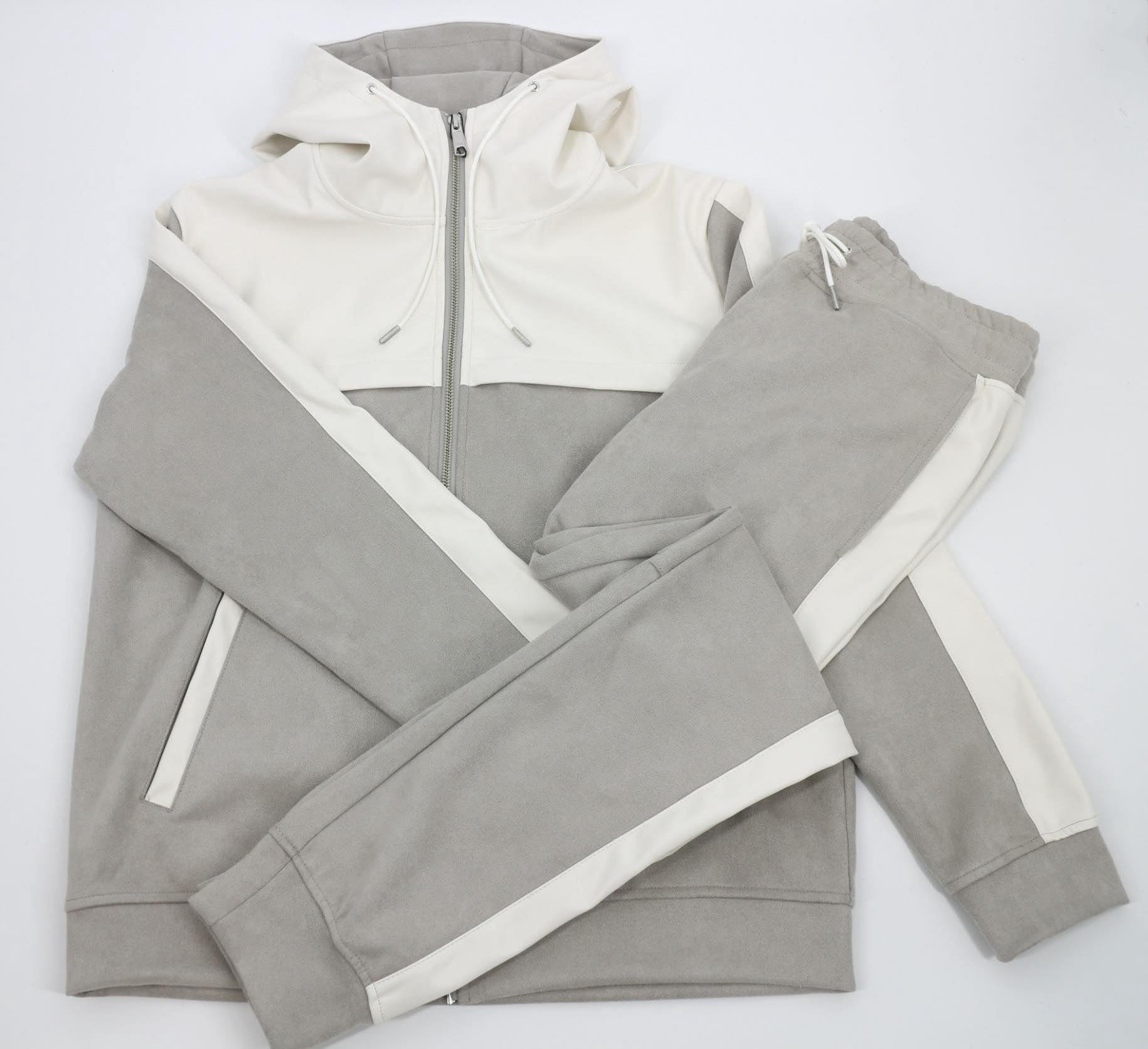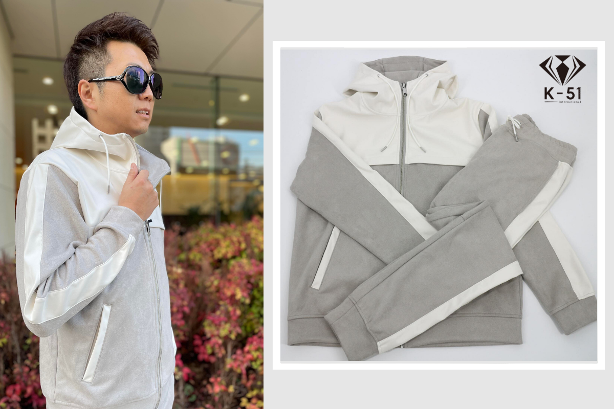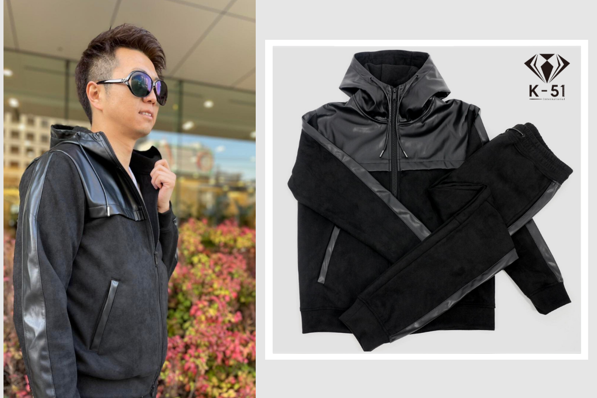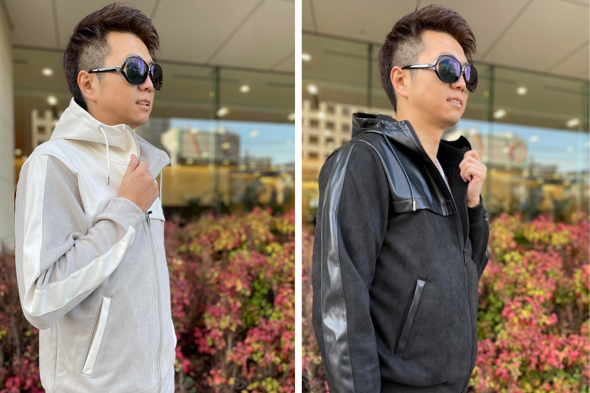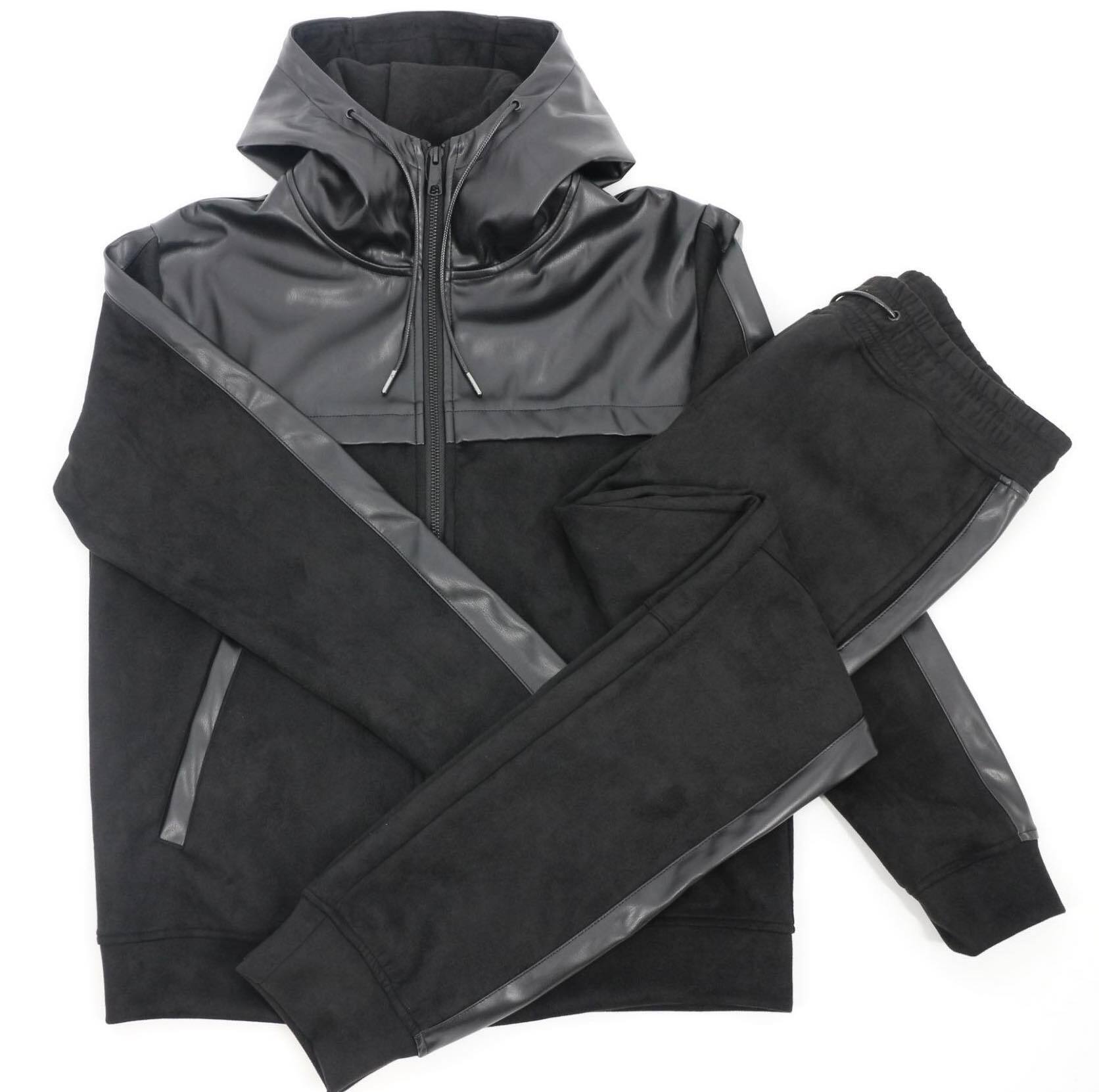 編込みニットセットアップに次いでおすすめのアイテム【スウェード×レザーセットアップ】をご紹介します。スウェード×レザーでモードなデザインながらもパーカーセットアップで程よい抜け感を演出。 色はグレーとブラックの2色展開です。