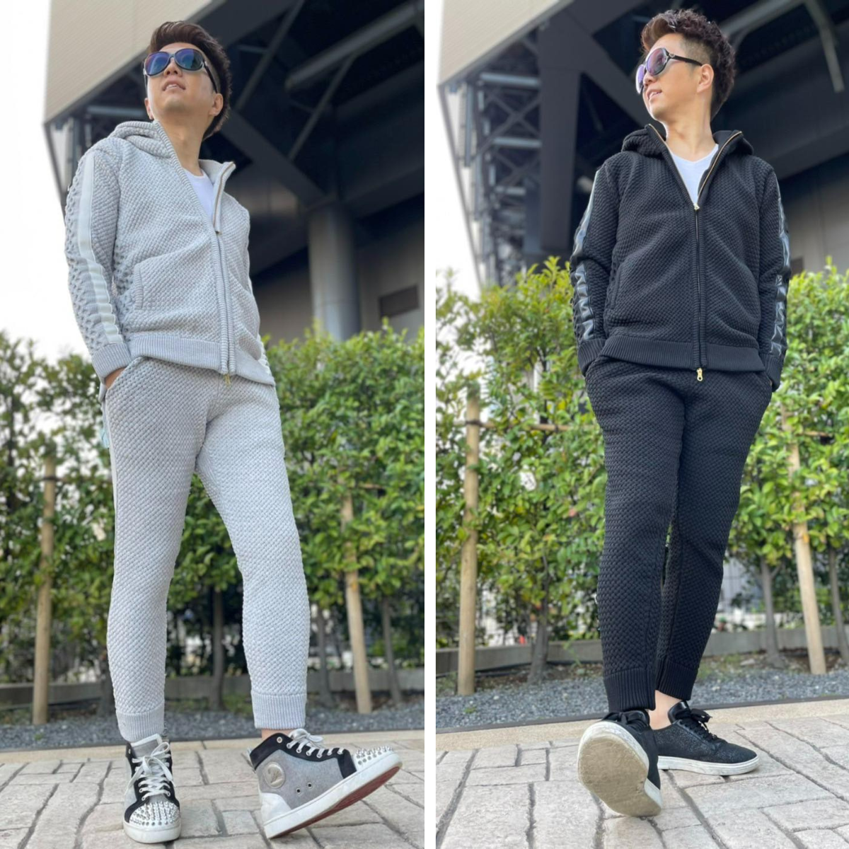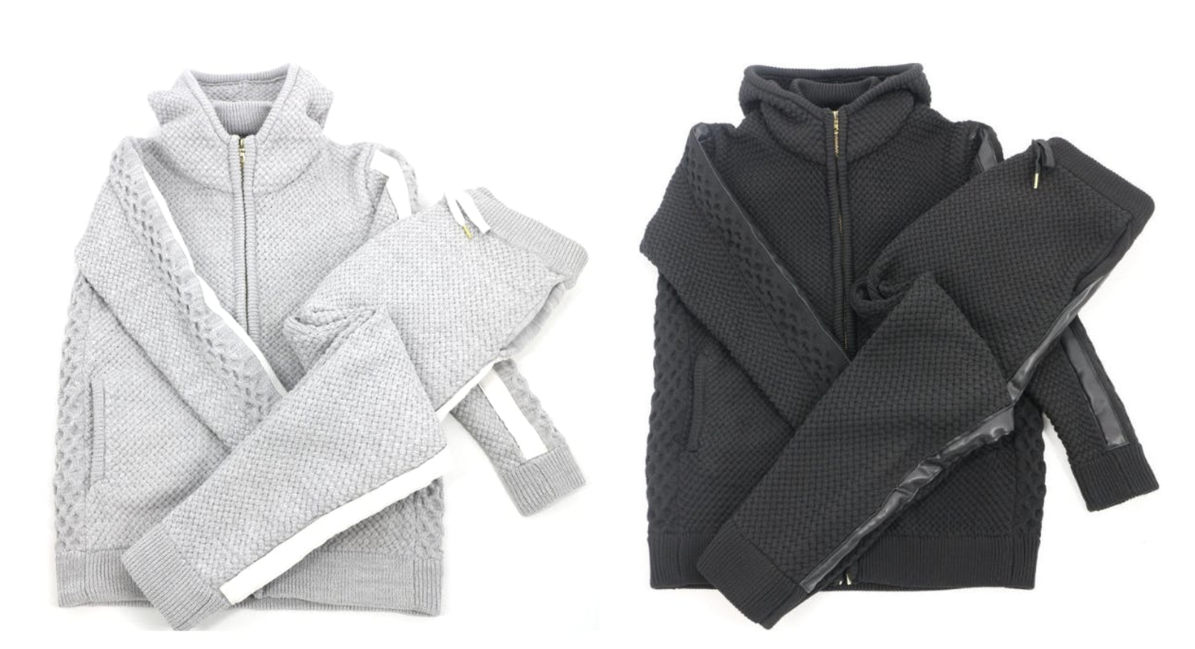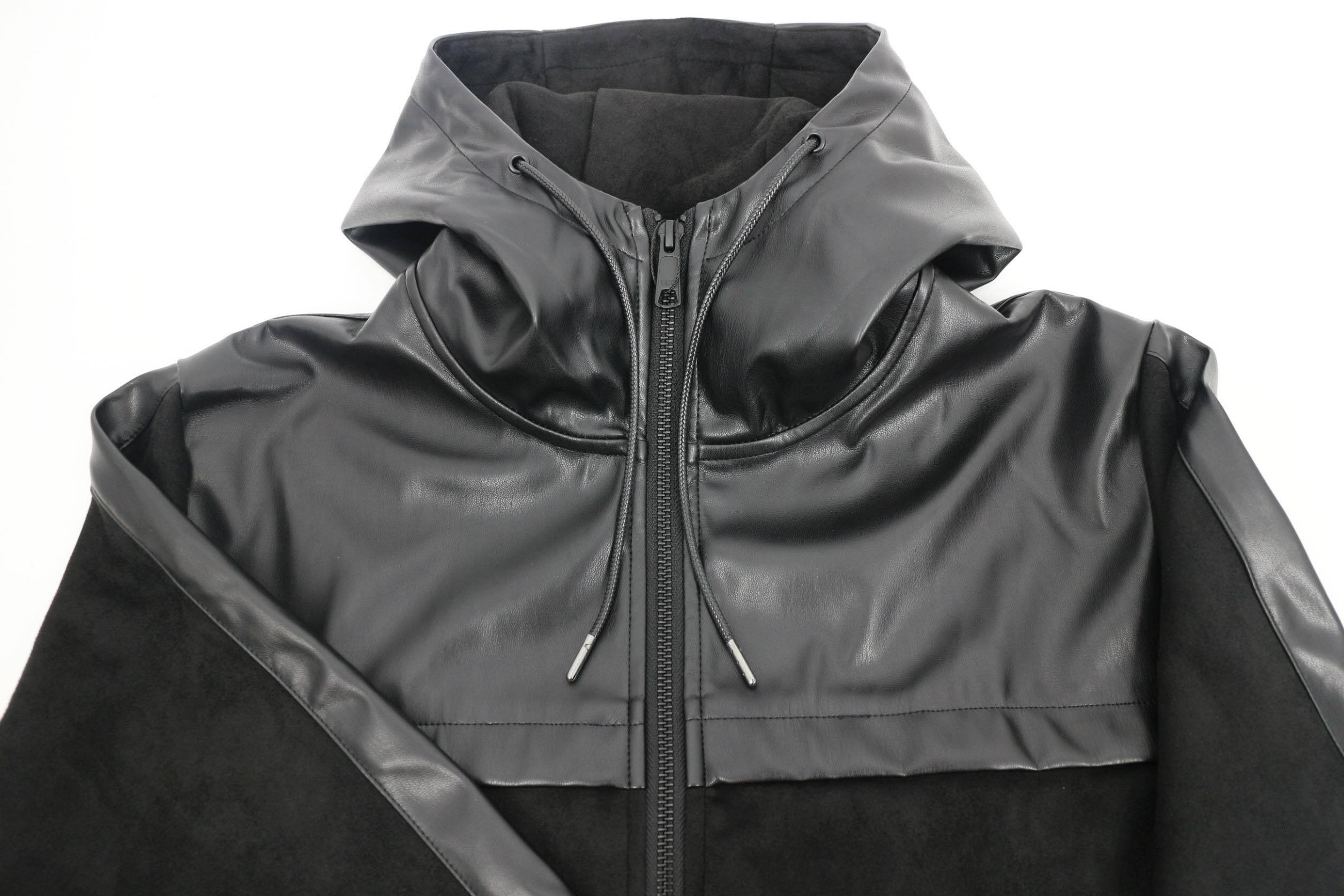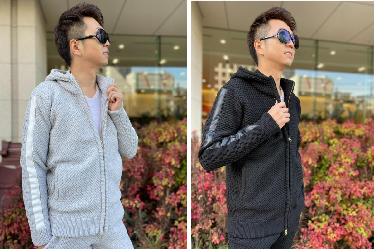 編込みニットセットアップに次いでおすすめのアイテム【スウェード×レザーセットアップ】をご紹介します。スウェード×レザーでモードなデザインながらもパーカーセットアップで程よい抜け感を演出。 色はグレーとブラックの2色展開です。