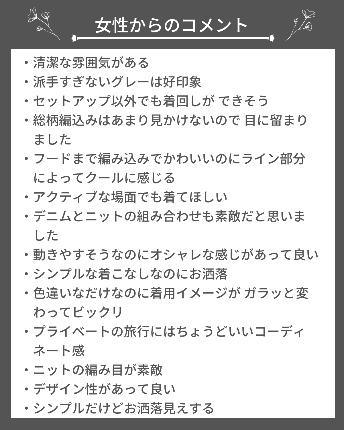 男性目線だけでなく女性ウケも抜群です。服選びにも困らずに好感度UPコーデを楽しめます!実際に女性からいただいた感想を、ご参考に掲載させていただきます。
