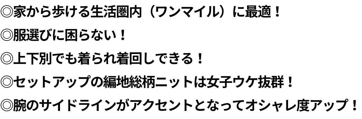 そこで思いついたのが、ワンマイルウェア【ワンマイル=約1.6kmの歩ける距離の生活圏内をお出かけするのにぴったりな服】でした。コロナ禍で生まれた新ファッションスタイルです。