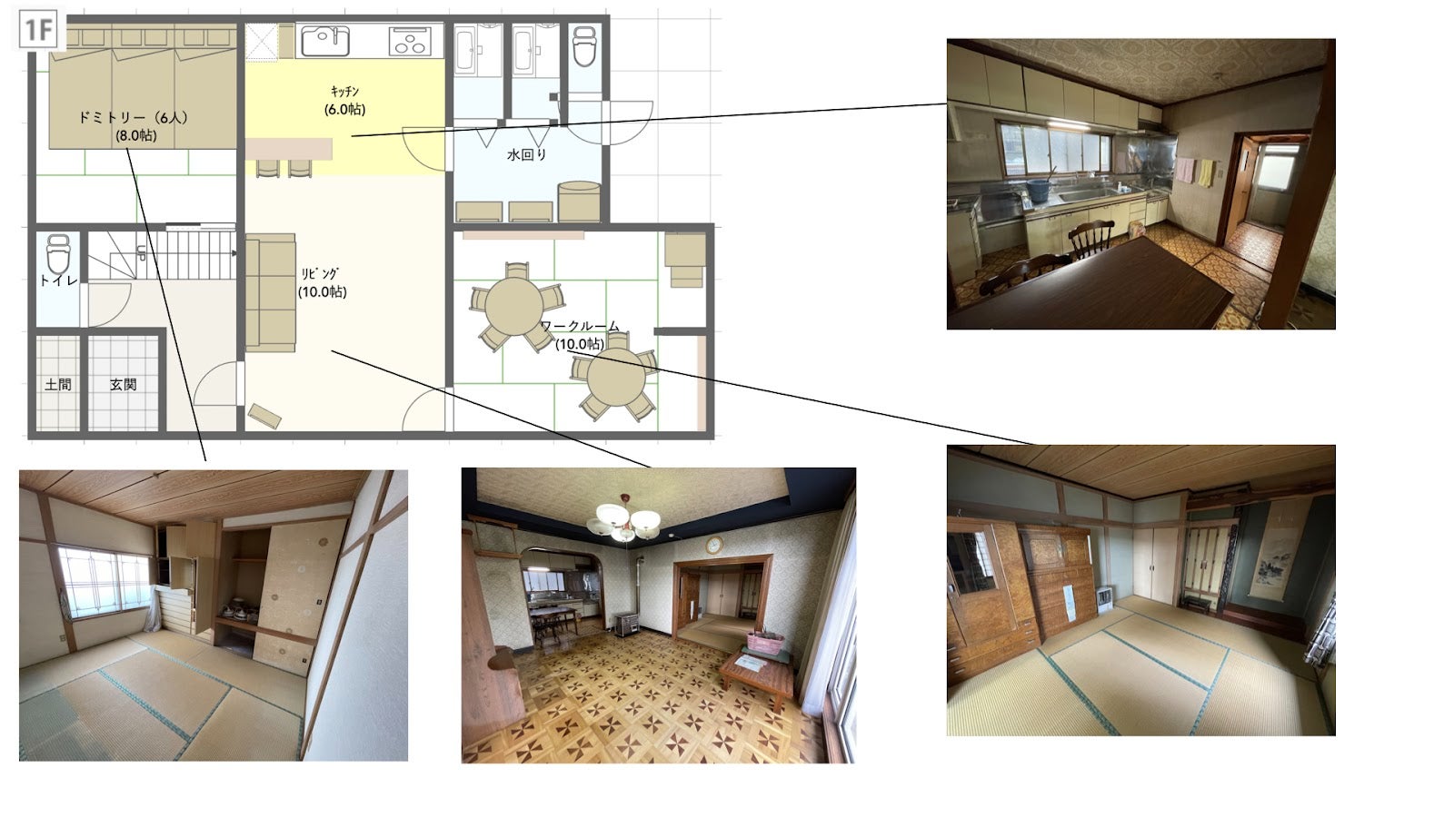 ゲストハウスの内装も少しずつ決まってきています。ゲストが交流しやすいように、最大10名程度の宿泊人数。僕も旅先でガッツリ仕事することが多いので、高速Wi-Fi付きのワークルームを完備。仕事環境にはこだわります。合宿利用もできるように、机は可動性の高いものを。プロジェクターなども完備します。空港も近いので、ぜひ一棟貸しで合宿地としても利用してみてください。