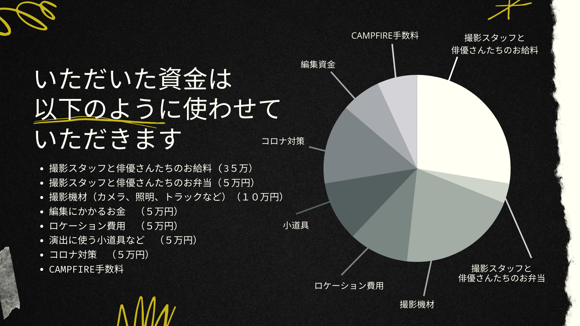 このプロジェクトで、現状不足している分の制作資金を十分に募ることで映画を完成させ、舞台となる町の人たちはもちろん日本、そして世界の人たちに見てもらい、都市開発について知ってもらうことが私たちのゴールです。