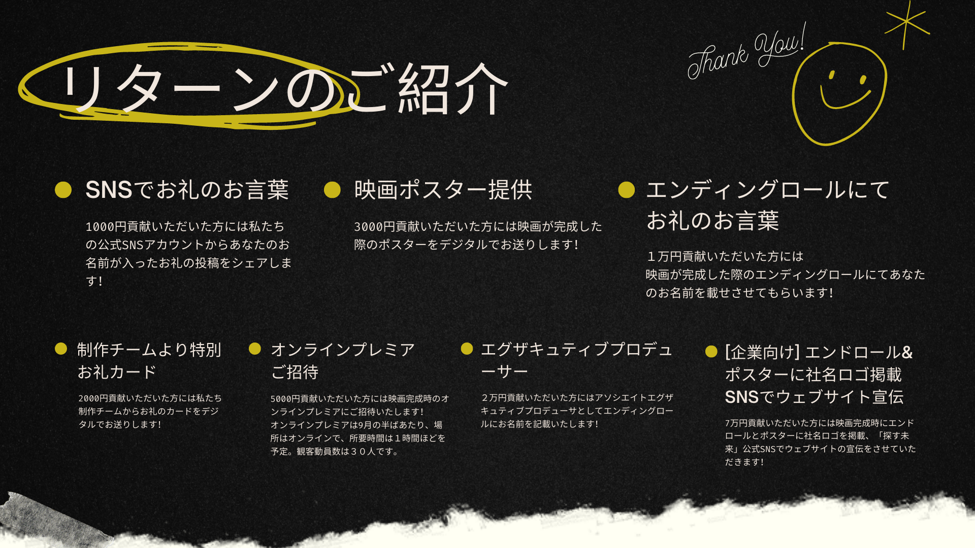 「探す未来」の制作に資金支援をしていただいた方に、様々なリターンを用意しています。ご支援いただく際に、決済金額の「上乗せ」も可能です。