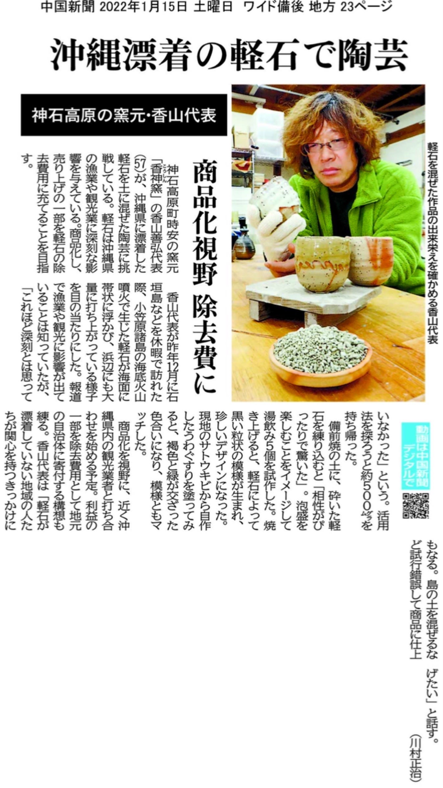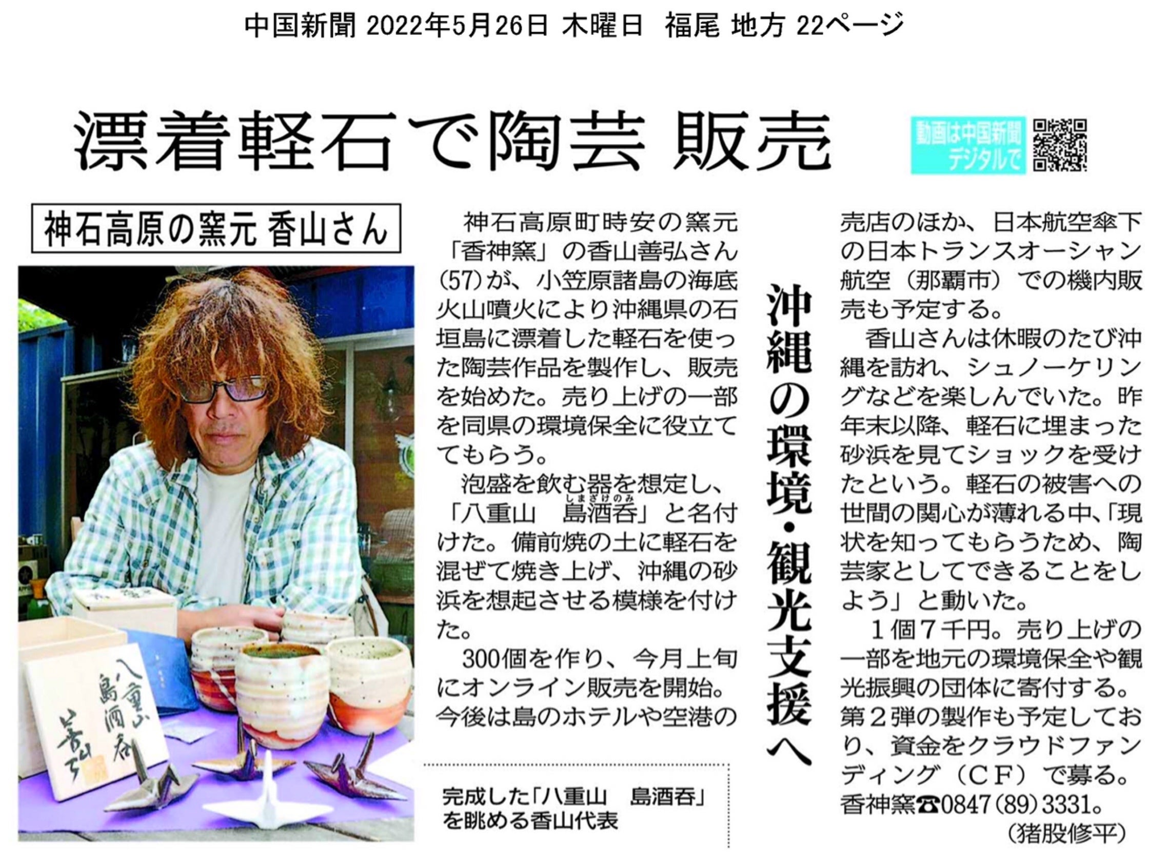 みなさん初めまして。広島県神石高原町で備前焼工房「香神窯」を運営しております香山義弘(カヤマ ヨシヒロ)と申します。この度は私たちのプロジェクト「八重山島酒呑プロジェクト 〜沖縄の軽石問題を備前焼と一緒に考える〜」を御覧,御支援いただき誠にありがとうございます。