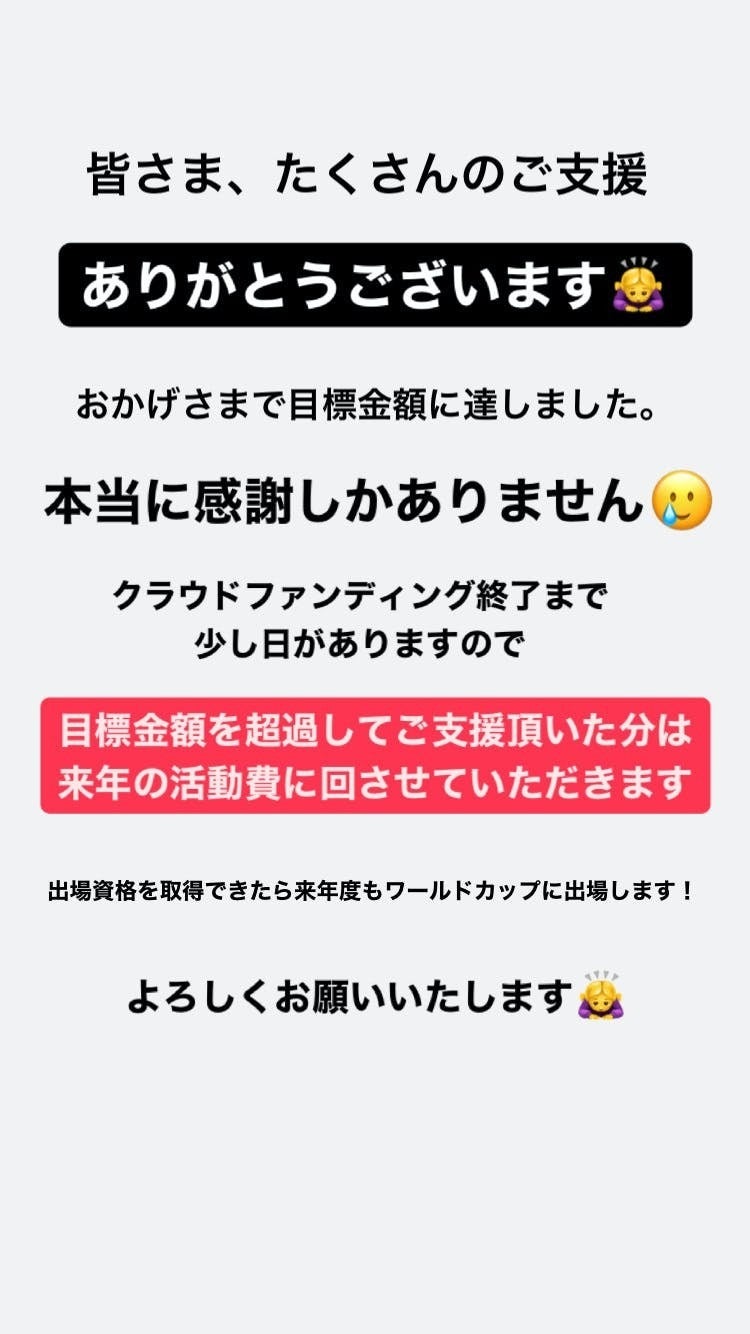 ※ワールドカップが中止になった場合や、金額超過した場合などはその分を国内戦の交通費、宿泊費、エントリー費、代表合宿への交通費、宿泊費等に当てさせて頂きます。