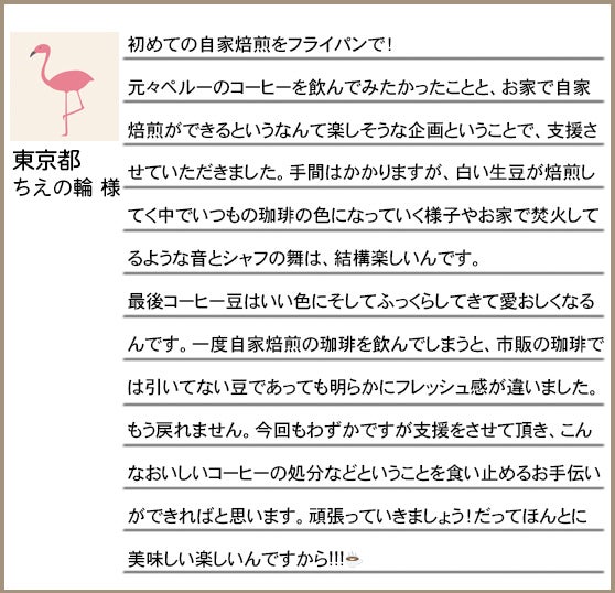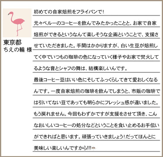 *ご支援 1,700円・・・1200g生豆(ノーピック不揃い)+お礼のメッセージ+フライパン焙煎レシピ