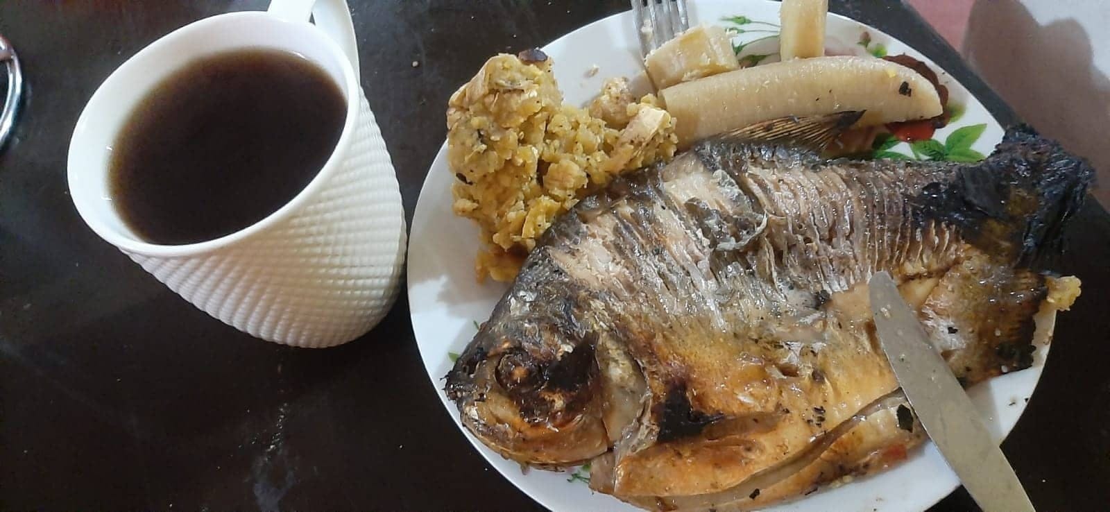 こちらはピラニアの焼き魚と茹でたバナナです。