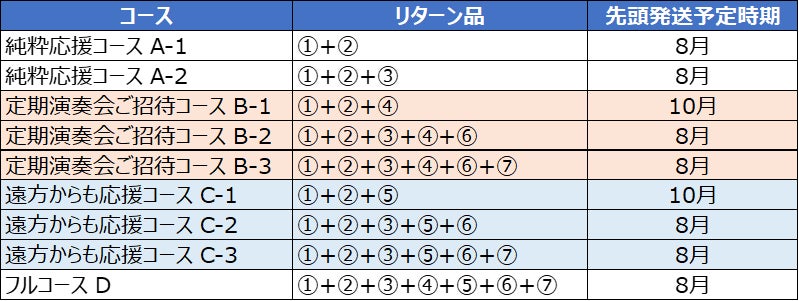 大きく分けて4コース、その中で下表のリターン品組み合わせによって複数設定しています。