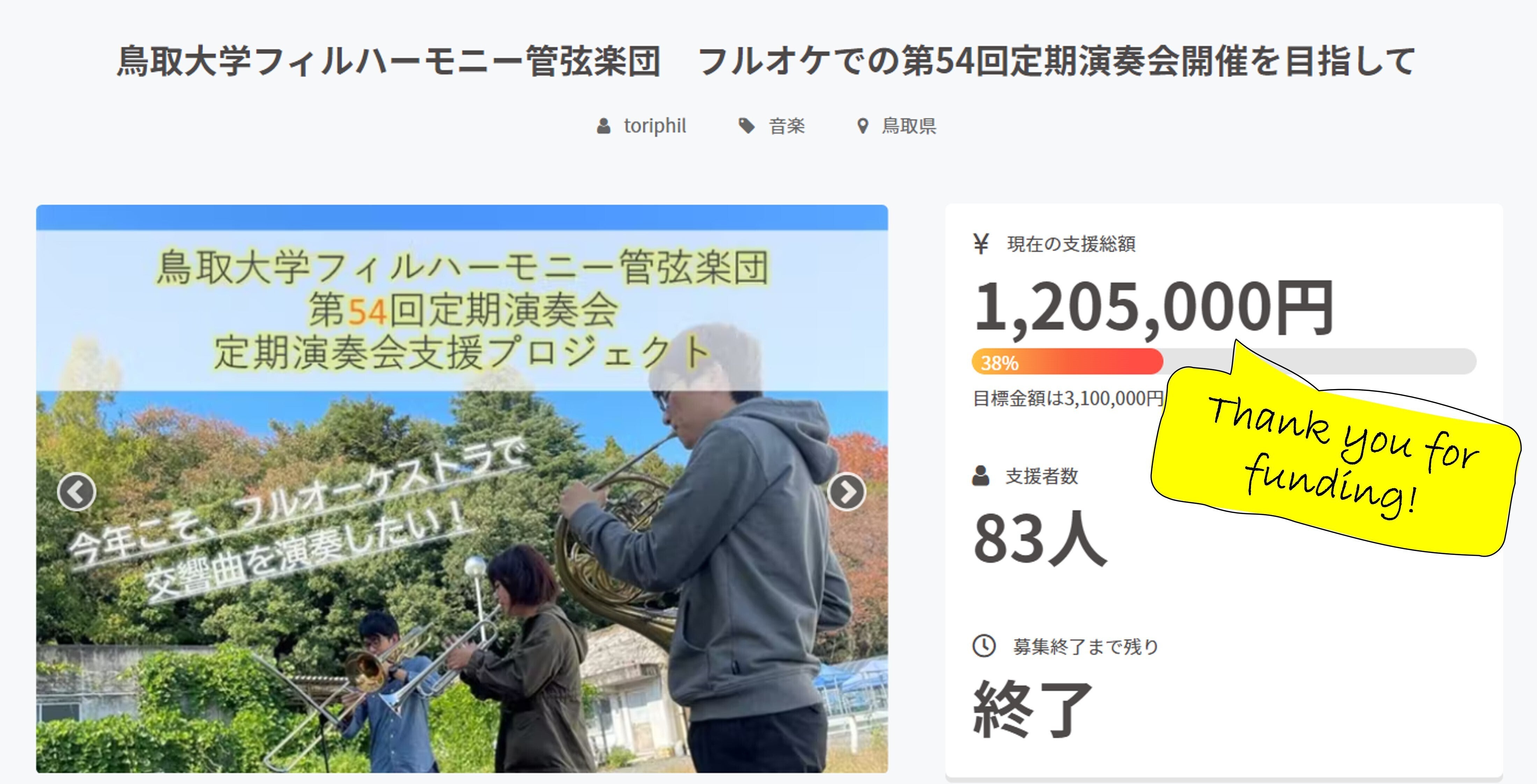 2022/07/25 09:00こんにちは!鳥取大学フィルハーモニー管弦楽団です。こちらでのご報告が遅くなり申し訳ございません。皆さまのご支援・ご協力により無事クラウドファンディング公開期間が終了し最終的に120万5千円の支援金が集まりました!本活動報告でも改めて感謝申し上げます。今後は、リターン品の準備を進めると共に定期演奏会本番に向けてまい進する所存です。その前に、大学の試験もありますのでこちらも頑張りたいと思います!CAMPFIREの活動報告やTwitter、Instagram等も随時更新するので是非、これからも鳥大フィルの応援をよろしくお願いいたします!! もっと見る