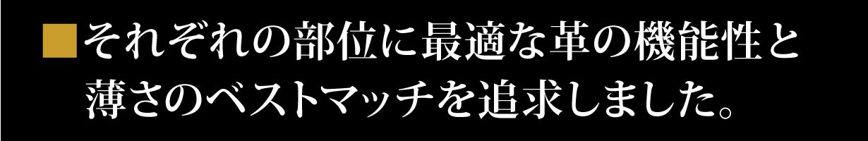 それぞれの部位に最適な耐久性、強靭性、柔軟性をかなえるため、各パーツの革の薄さを1mm以下のレベルで何度となく徹底的に調整しました。