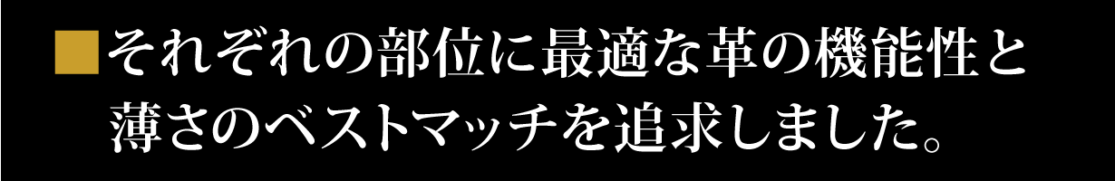 それぞれの部位に最適な耐久性、強靭性、柔軟性をかなえるため、各パーツの革の薄さを1mm以下のレベルで何度となく徹底的に調整しました。