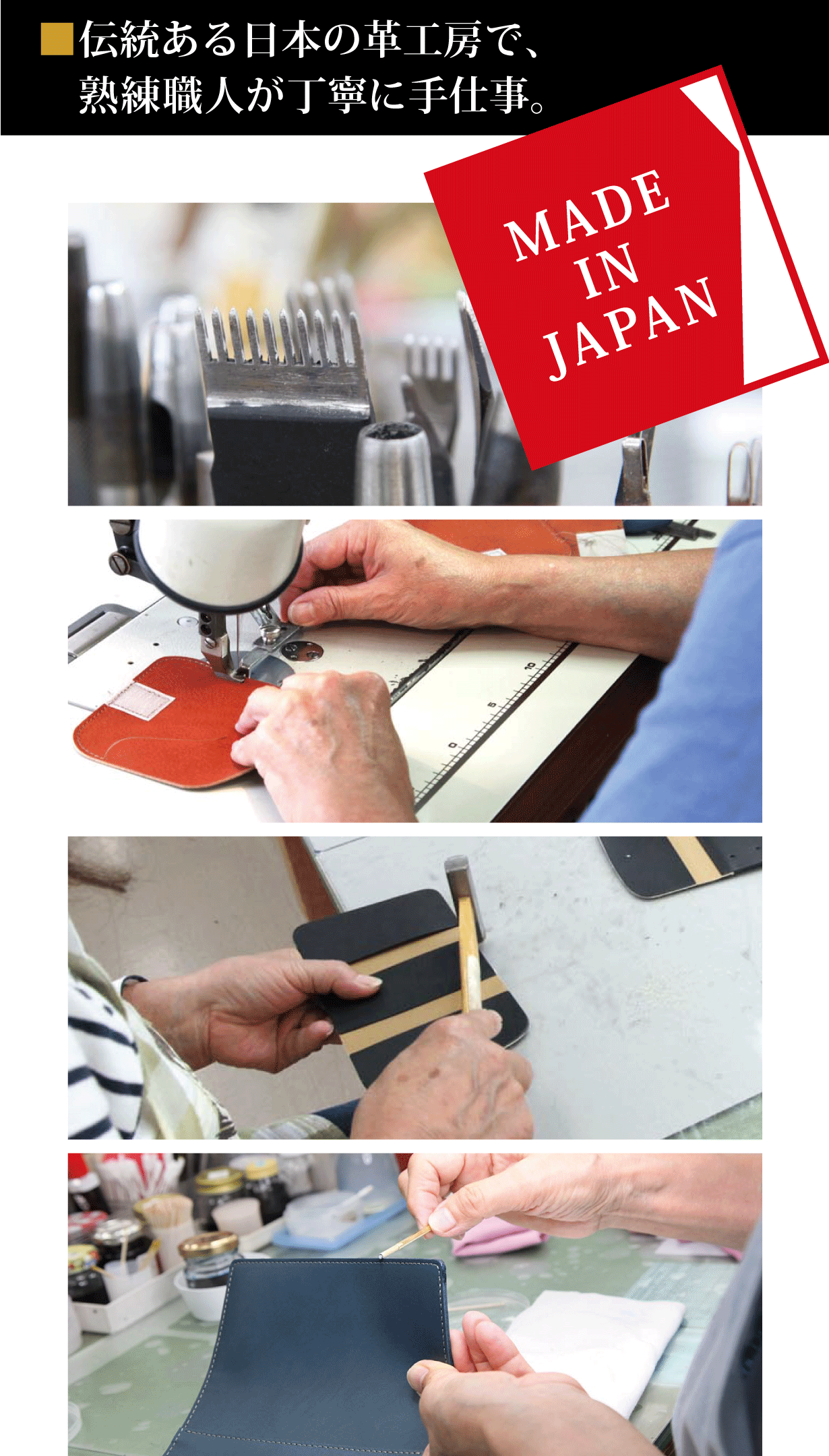 革の裁断から熱押し、漉き、貼り、本裁ち、ミシン、小端塗り、検品までのすべての工程をワンストップで実現する、全国でも数少ない専門工房です。