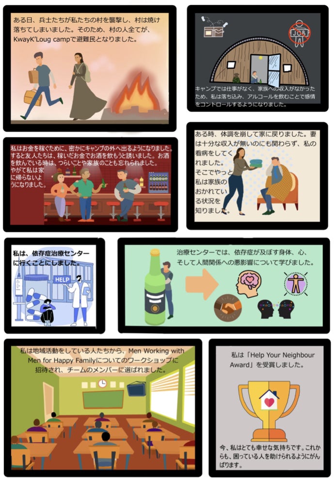 写真5枚目にある漫画は、「K International School」 に通う避難民支援に熱心な 『HEART club』の学生たちが作成いたしました。REIは学生との交流を通じて避難民支援も行っております。