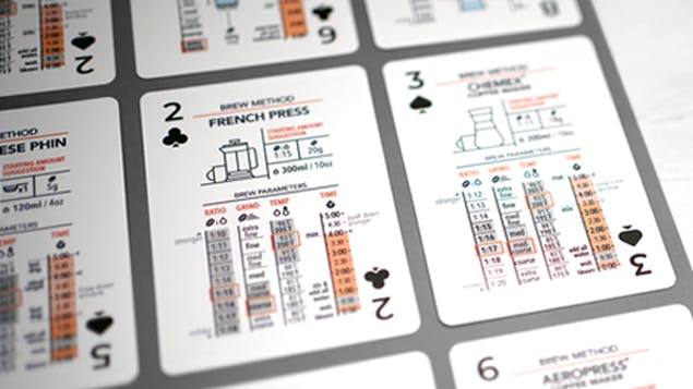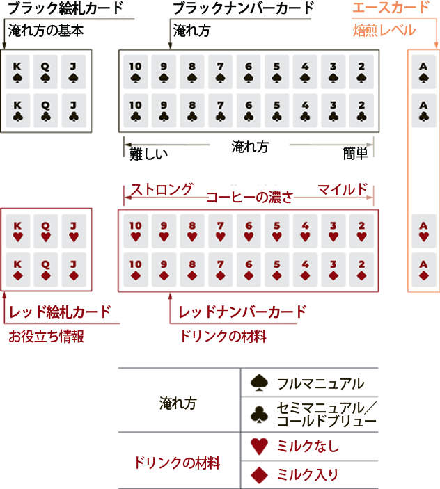 カードの数字が大きくなるほどシンプルな淹れ方から複雑なものに変化。レシピはマイルドから強いものへ順に配置。レベルに合わせて試しやすい構成です。