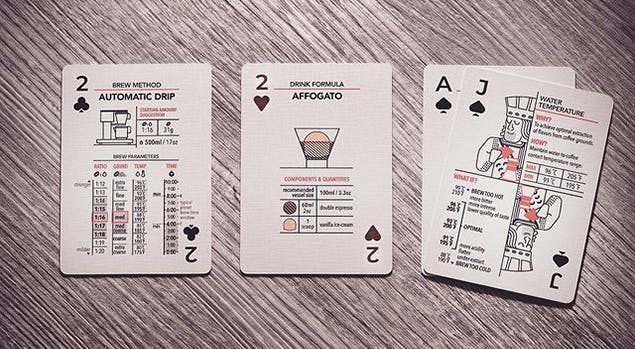 52枚のトランプカードの中に、コーヒーやエスプレッソの淹れ方18種類とレシピ18種類をイラスト中心で分かりやすく解説。