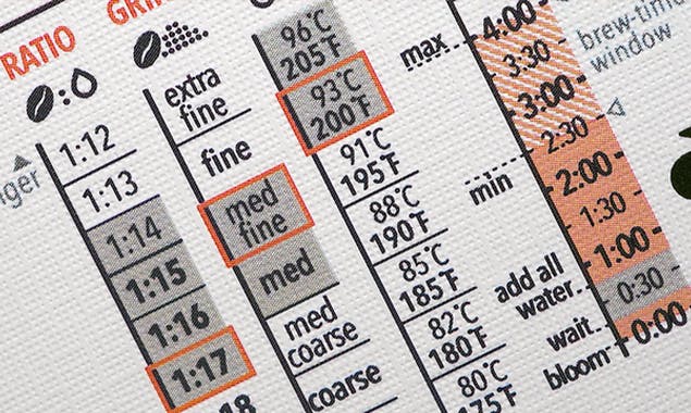 淹れ方の推奨割合、挽き加減、温度、タイミング、スタート点などが描かれています。