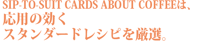SIP-TO-SUIT CARDS ABOUT COFFEEの内容は、バリスタ資格保持者が、数え切れないほどのコーヒーの本やインターネットのサイトの情報を1つ1つ丁寧に確認、精査して「コーヒーやエスプレッソの淹れ方やレシピのスタンダートとは何か?」を追求して作り上げたものです。