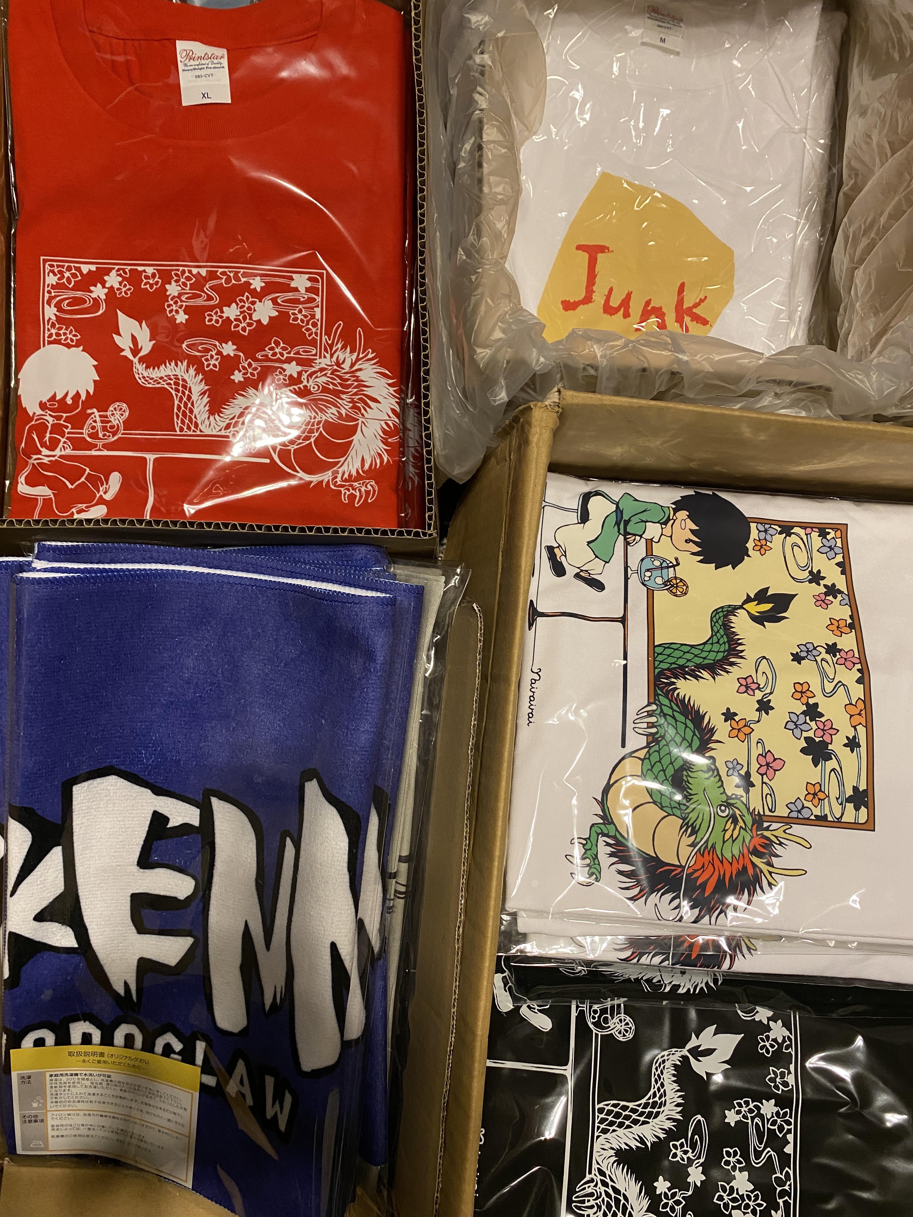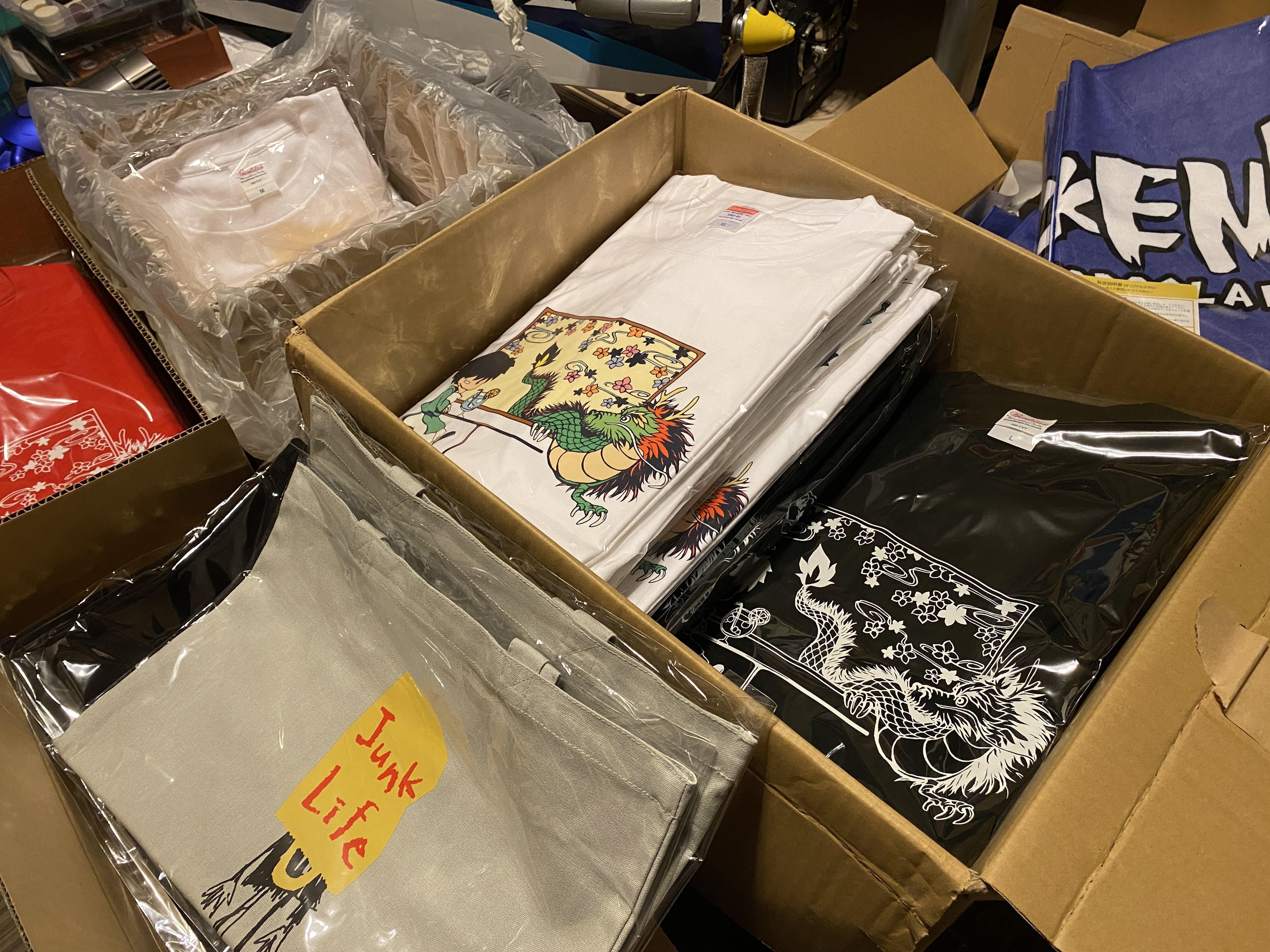 今回は、Tシャツ、タオル、トートバッグ、グラス、喉黒一ファーストアルバム、各限定リターンのお届けです。
