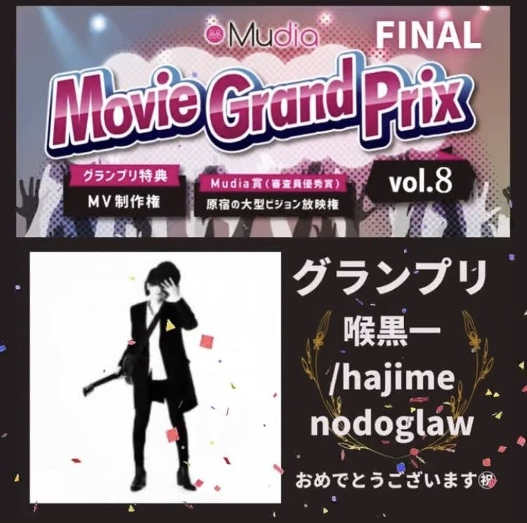 初めは1人でも多くの人に喉黒一の歌を聴いて欲しいという理由での参加でしたが、喉黒一の活動をもっと後押ししたいという力が一丸となって突き進んだ結果、敗者復活から大逆転しかも僅差でグランプリを獲得いたしました!これには喉黒一本人も予想していなかった事!ただ今急ピッチで制作に励んでいます。