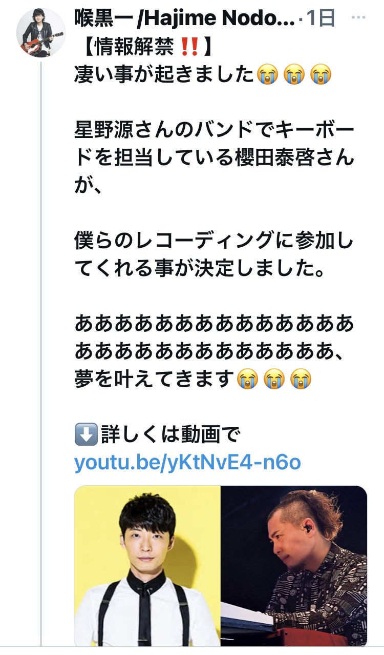 これが最後のバンドにしようと活動していた喉黒一のバンドが解散。落胆し何もすることが出来ず希望を失っていた日々に、星野源さんの曲と出会いキーボーディストである櫻田泰啓さんの鍵盤に胸打たれ、もう一度音楽活動を始めるきっかけになったそうです。