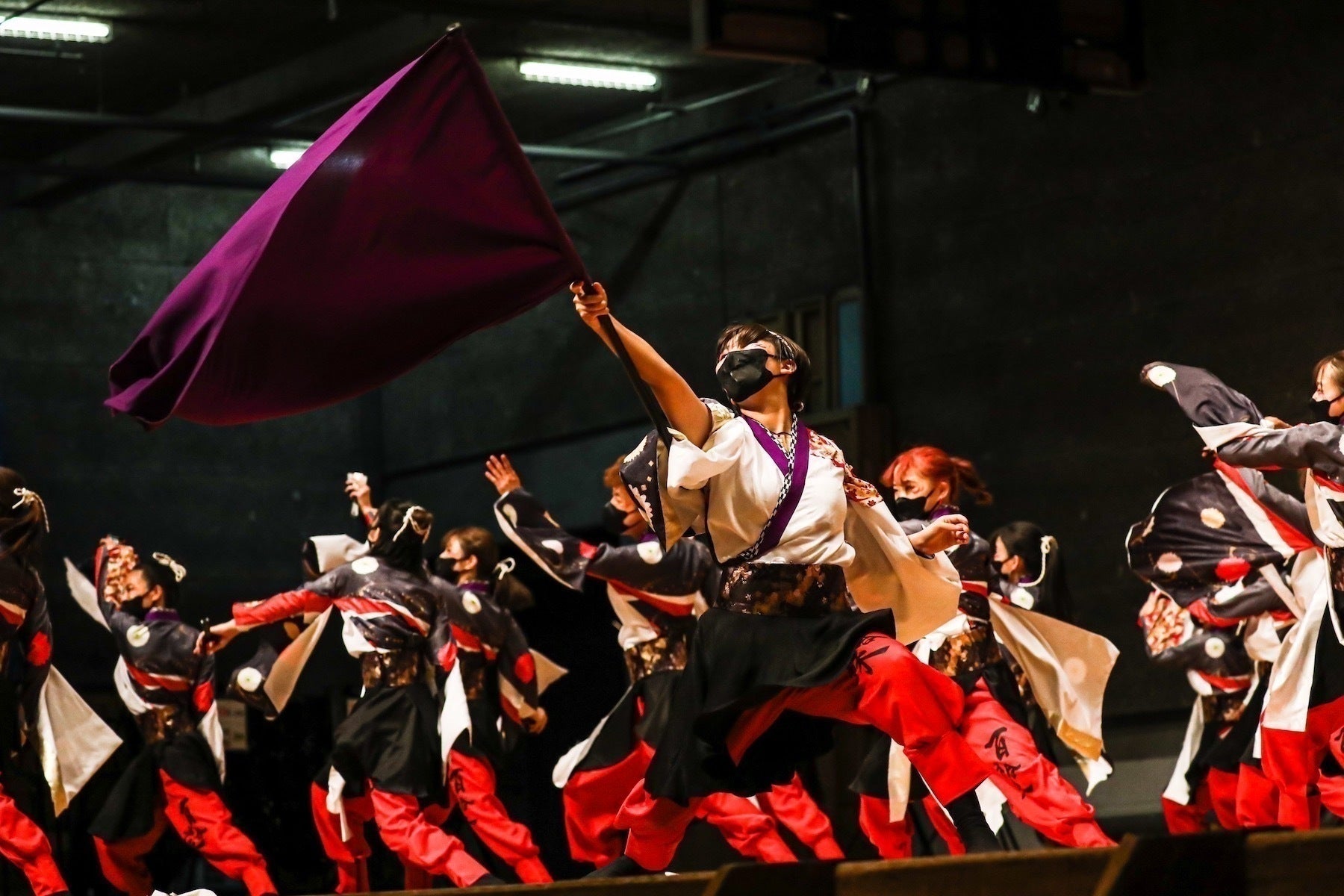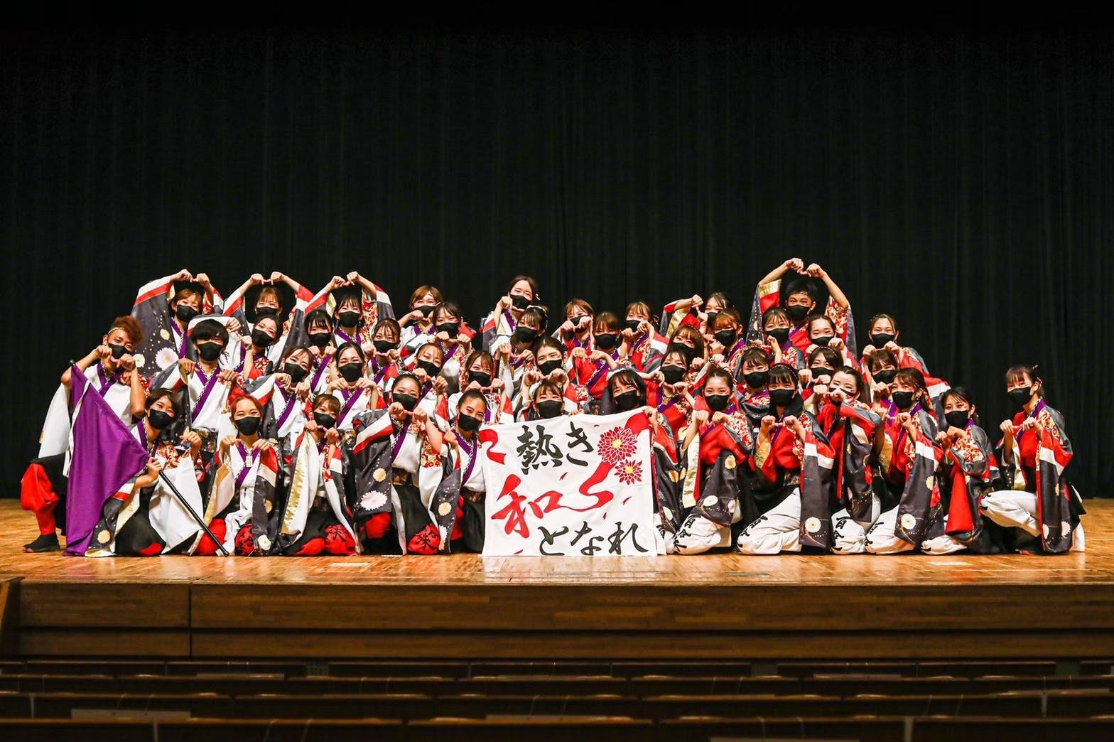 あやつなぎは「結び目が非常に固く、緩まない」のが特徴である結び方の一種です。また、「あや」はガーベラの別名であり、花言葉は「常に前進」、特に紅色は「情熱」・白色「希望」という意味があります。コロナ禍での苦難や葛藤に打ち勝ち、仲間と「和」になって踊ろう、というテーマで前進し続けました。