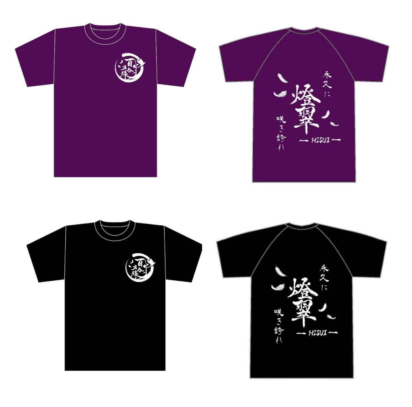 Tシャツの生地のカラーは紫または黒色です。サイズ展開はS~LLになっております。下記の表をご参照ください
