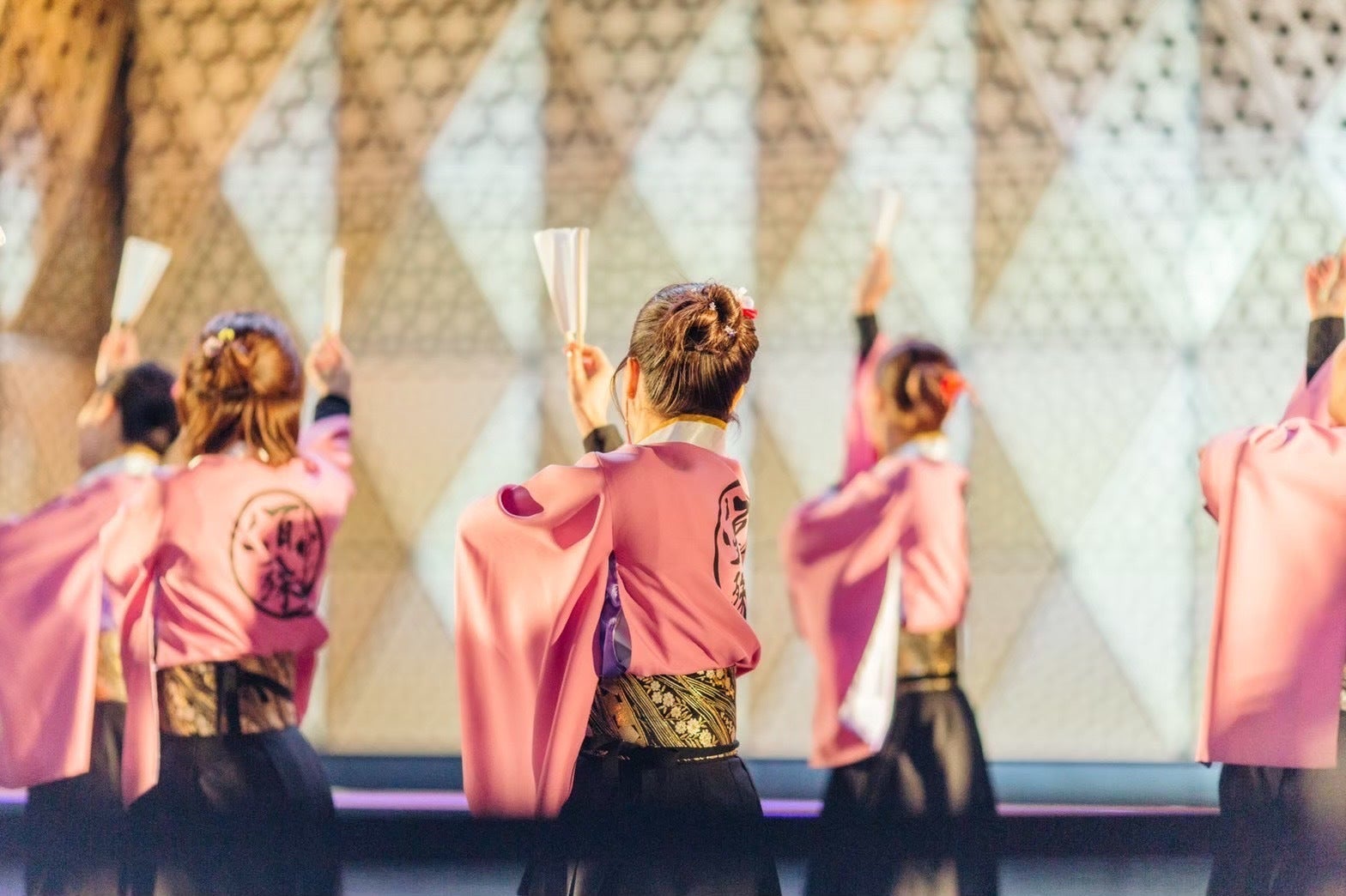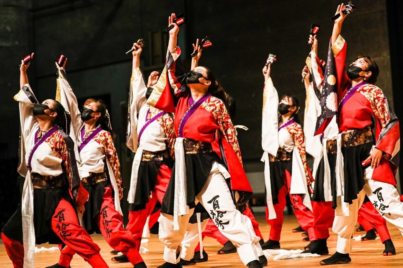 あやつなぎは「結び目が非常に固く、緩まない」のが特徴である結び方の一種です。また、「あや」はガーベラの別名であり、花言葉は「常に前進」、特に紅色は「情熱」・白色「希望」という意味があります。コロナ禍での苦難や葛藤に打ち勝ち、仲間と「和」になって踊ろう、というテーマで前進し続けました。