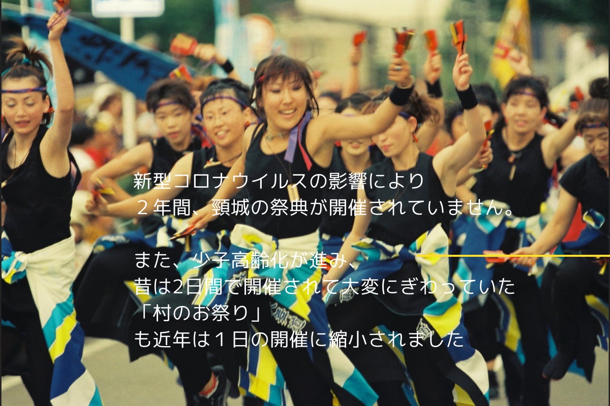 新型コロナウイルスの影響により2年間、頸城の祭典が開催されていません。また、少子高齢化が進み、昔は2日間で開催されて大変にぎわっていた「村のお祭り」も近年は1日の開催に縮小されました。※現在は上越市