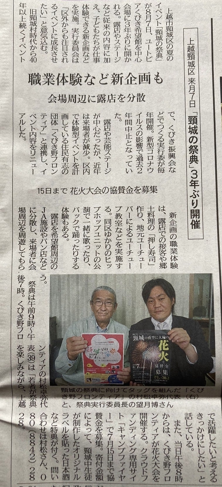 また、頸城の祭典の開催が近年では1日間での開催ですがイベントが盛り上がり、以前のように2日間の開催に戻せるようであれば、戻したいと思いますし、年1回ではなく、頸城の祭典とは違う形でも地域活性を目的に、年に複数回の開催も考えていきたいと思います。
