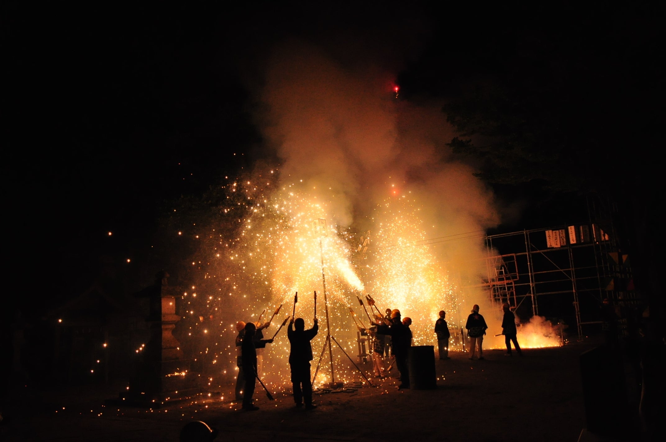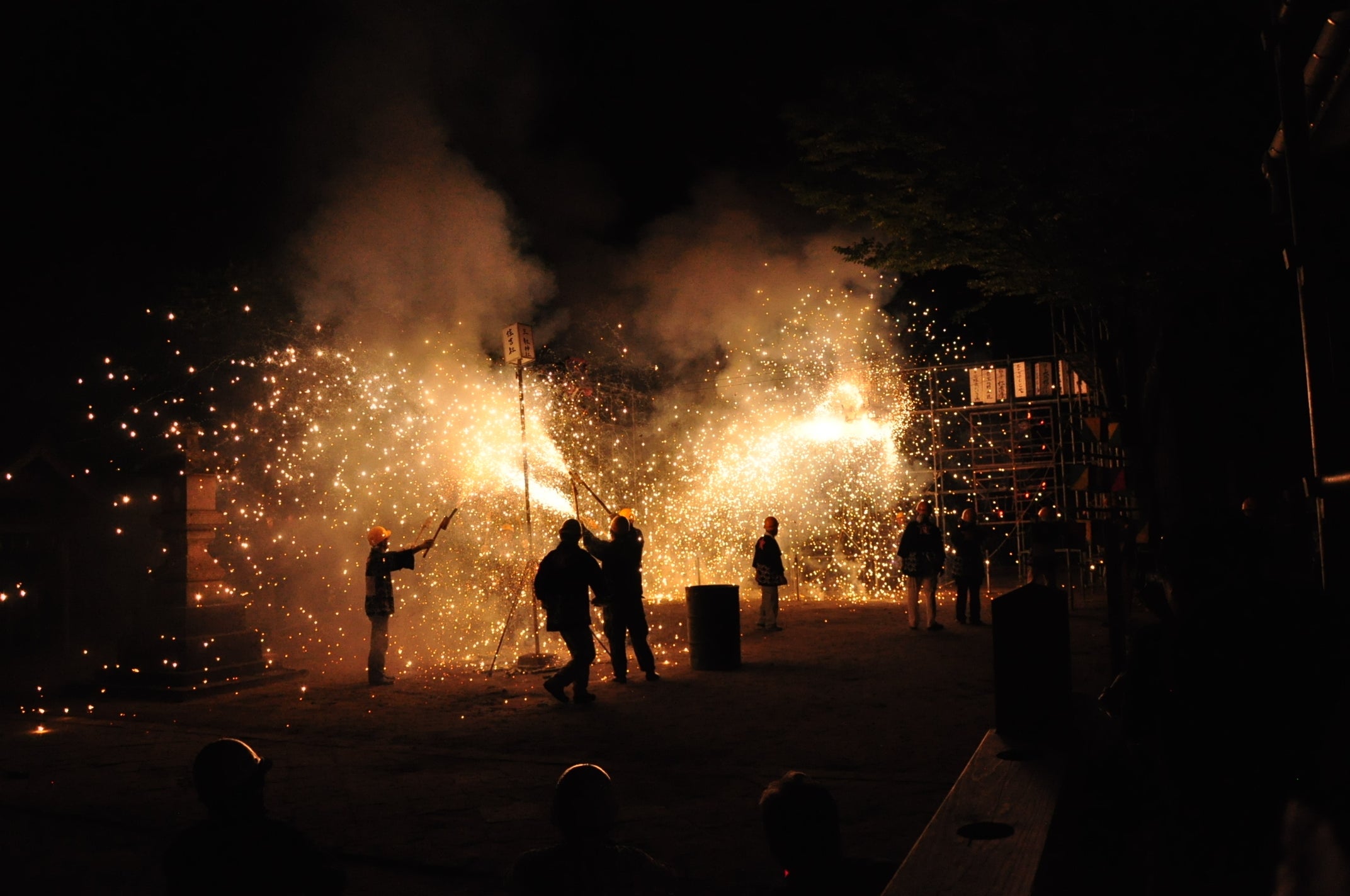 また、日本でもめずらしい花火囃子の音色にのせて地元花火師の草花火が、神社の境内で豪快に火を噴きながら上げられる、大変活気のあるお祭りでした。