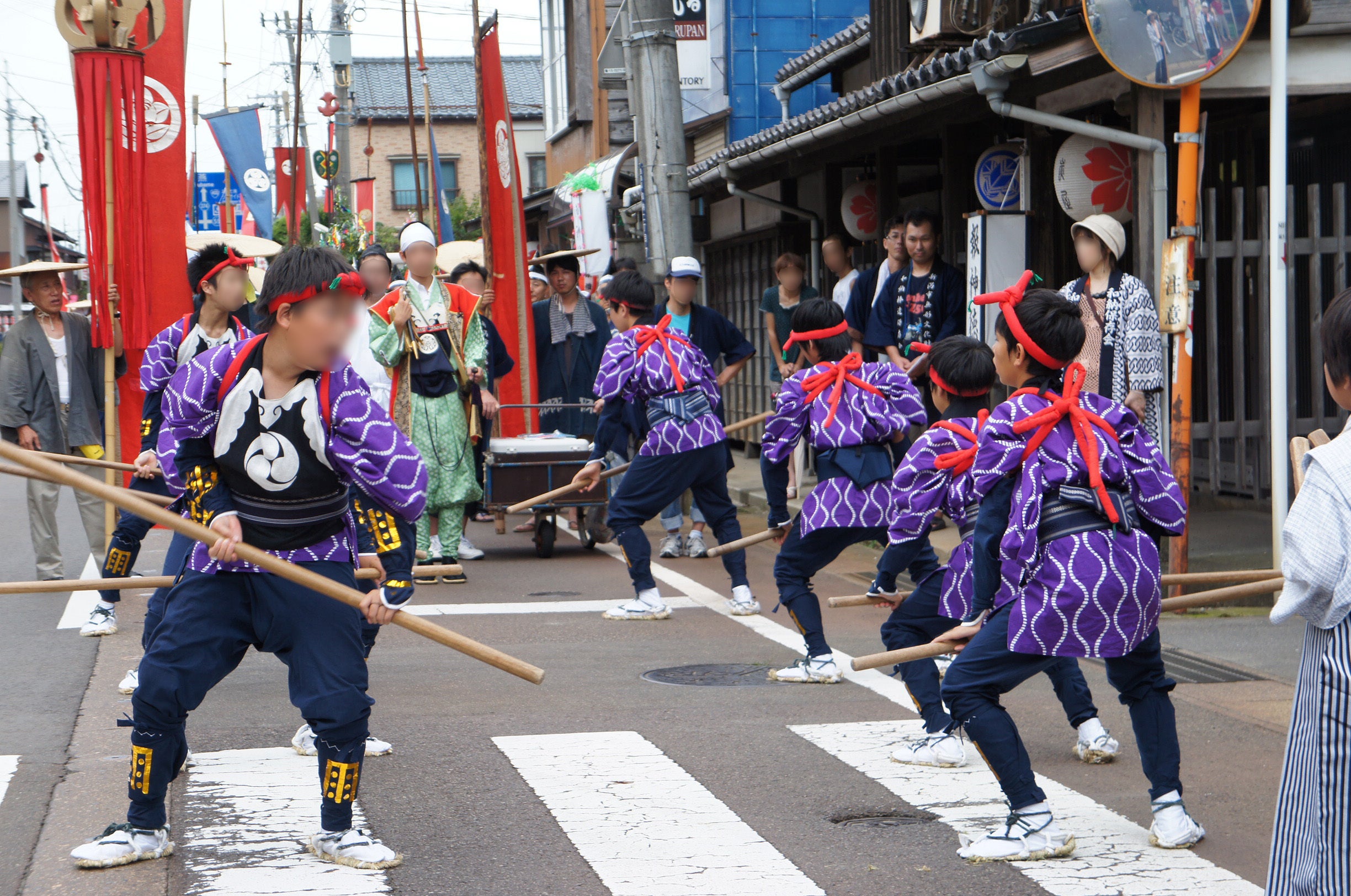 延べ2日間にわたるお祭りで、上の神社から下の神社まで町中を神輿が練り歩く神輿渡御や、新潟市の無形文化財に指定されている、15歳以下の少年たちで結成される棒遣いによる奉納演舞などがもようされます。