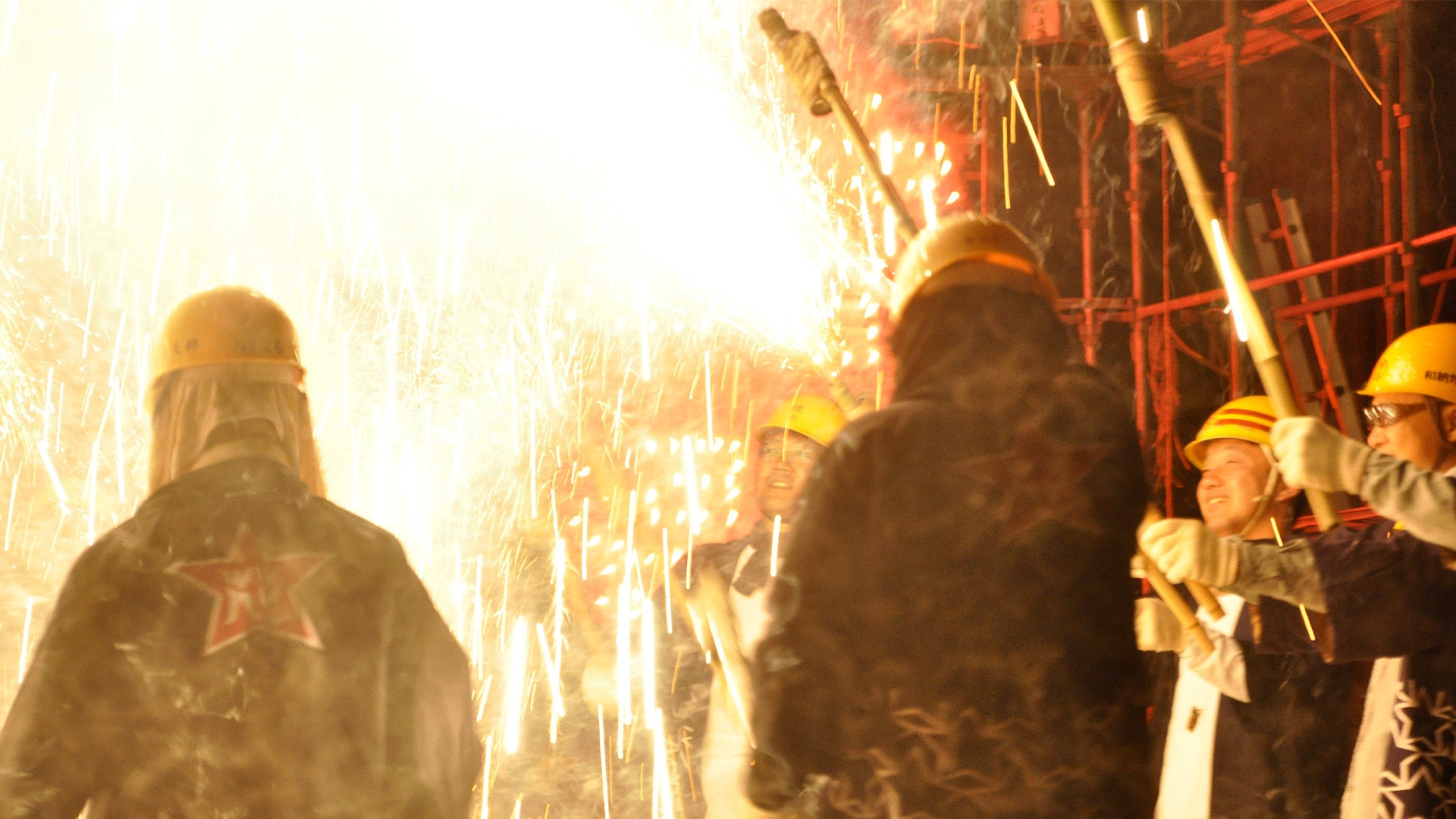 手持ちの草花火以外にも滝のように火の粉が流れ落ちる仕掛け花火や、火花を噴き出しながら綱を渡る花火神輿なども一手に手掛けています。
