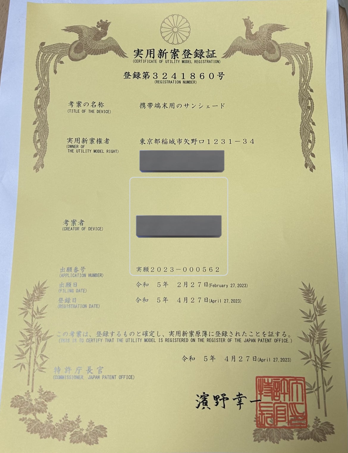 スマホホルダーカバーは実用新案登録を申請しており、プロジェクトページに実用新案申請中と記載をさせていただいていましたがついに実用新案登録がされました!