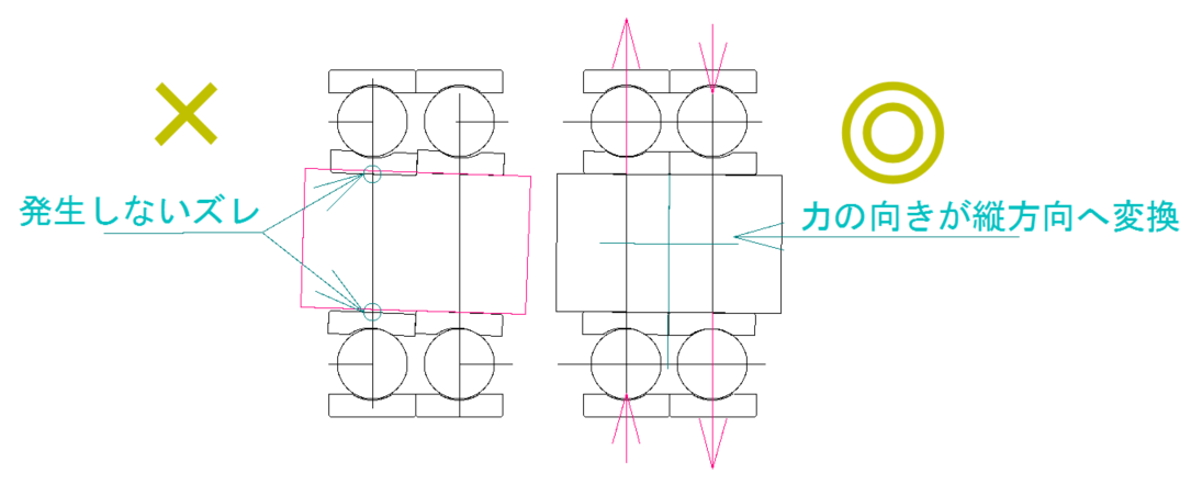 ① ベアリングの優位性①でもご説明をした通り、シャフトの剛性アップとベアリングの並列にすることで歪みが軽減されます。