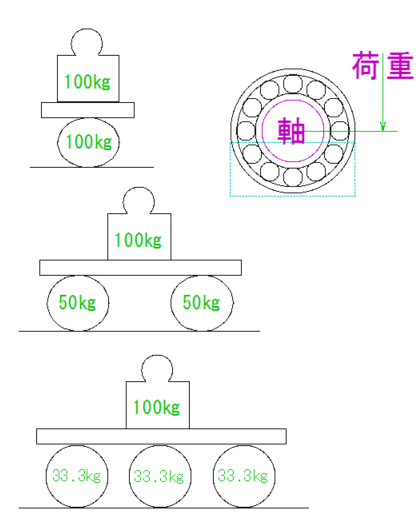 ② ベアリングは、荷重によりつぶされております。真球が転がりにおいて最良であれば、変形は転がりの敵となります。この敵を解消していくには、荷重を分散する必要があります。それは、ボールの数または硬度であります。