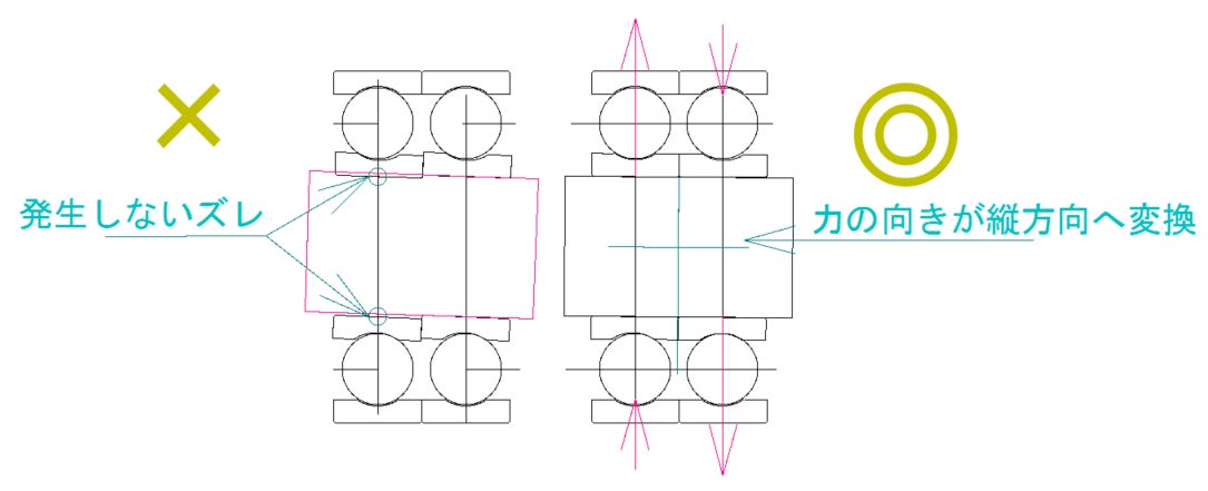 シングルで発生したようなレースの歪みは、シャフト剛性アップに併せ、ダブルベアリングにすることで並列するベアリングが互い押し合い歪みを発生しにくくします。左のように個々のレースが歪んだと想定した場合、ベアリンク内径サイズのシャフトが貫通している限り発生しません。それにより、ねじれで発生したベアリングのずれきしみは、縦方向へ変換され回転の落ち込みを軽減することができます。
