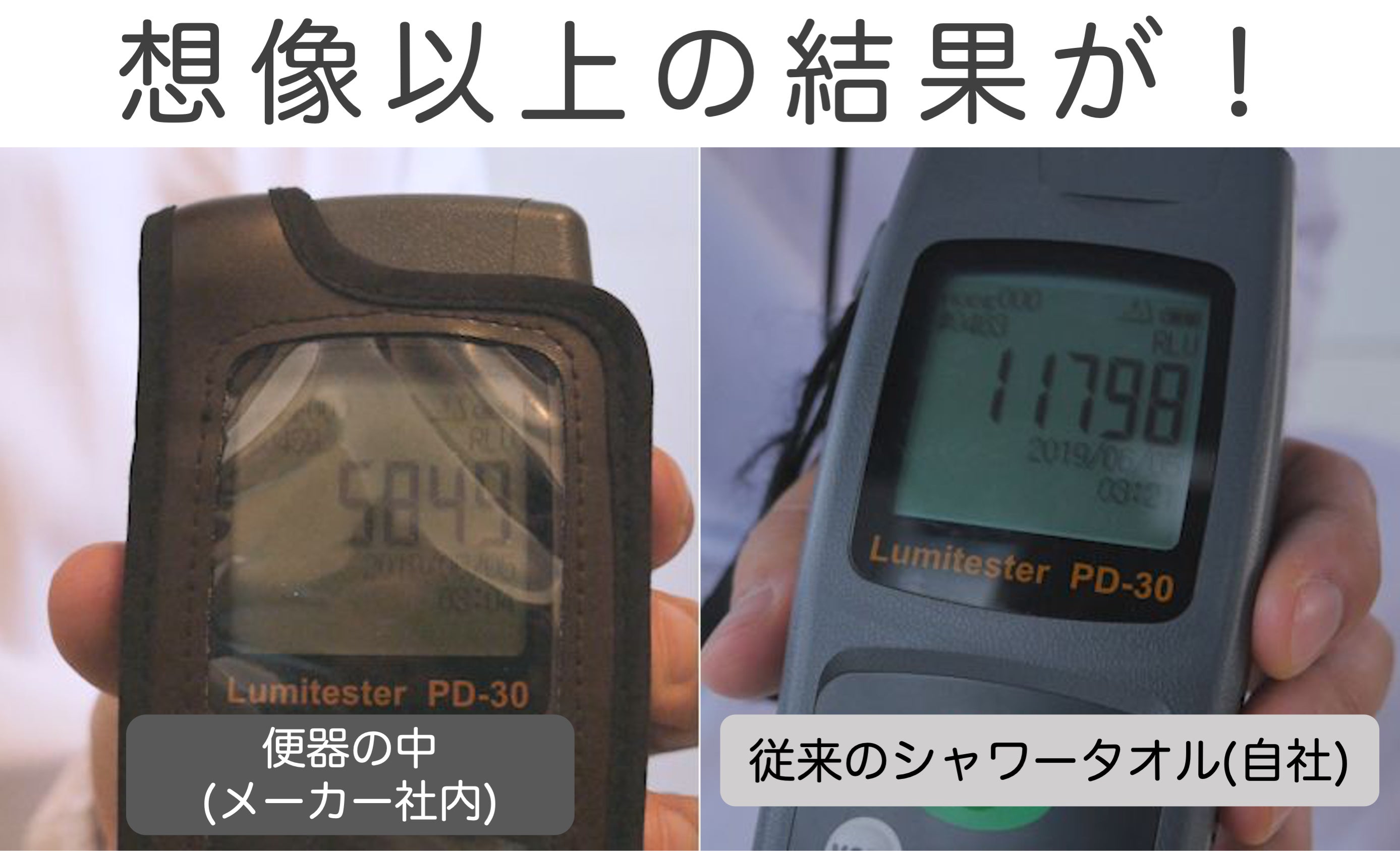 便器の中より普段使っていたシャワータオルの方が2倍高く細菌汚染度(RLU)が測定されました。