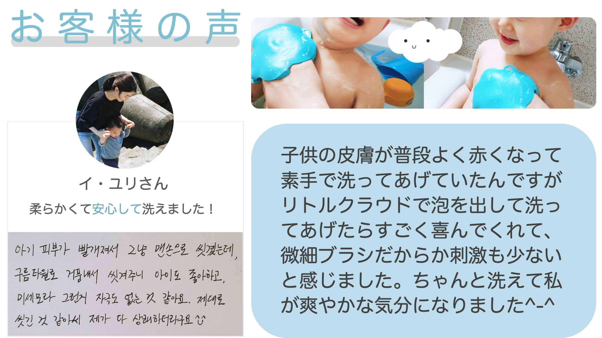 今まで子供を素手で洗ってあげていましたか?プレミアムシリコンのリトルクラウドで洗ってあげてみてください。柔らかくて気持ちの良い肌触りで子供も喜んでお風呂を楽しんでくれます。