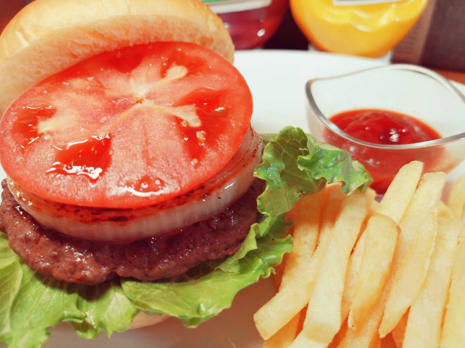 パテ、オニオン、トマト、レタスというシンプルな構成ながら、パテの迫力は圧巻のひとこと。