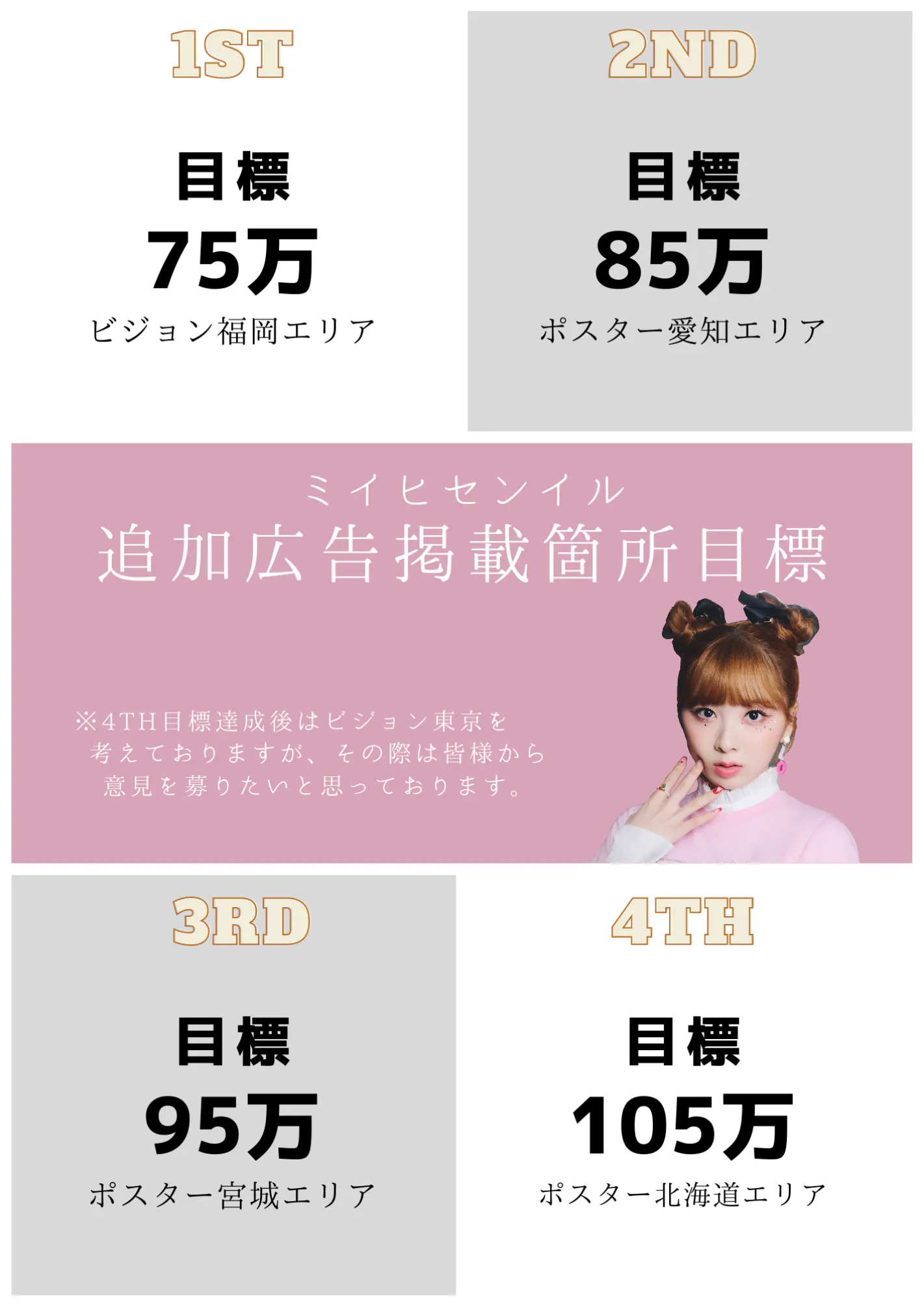 東京エリア、ミイヒちゃんの出身地京都エリア、福岡エリア。を目標としてます。多くの金額が集まった際には更なる広告の掲載やSNS広告も検討しています。