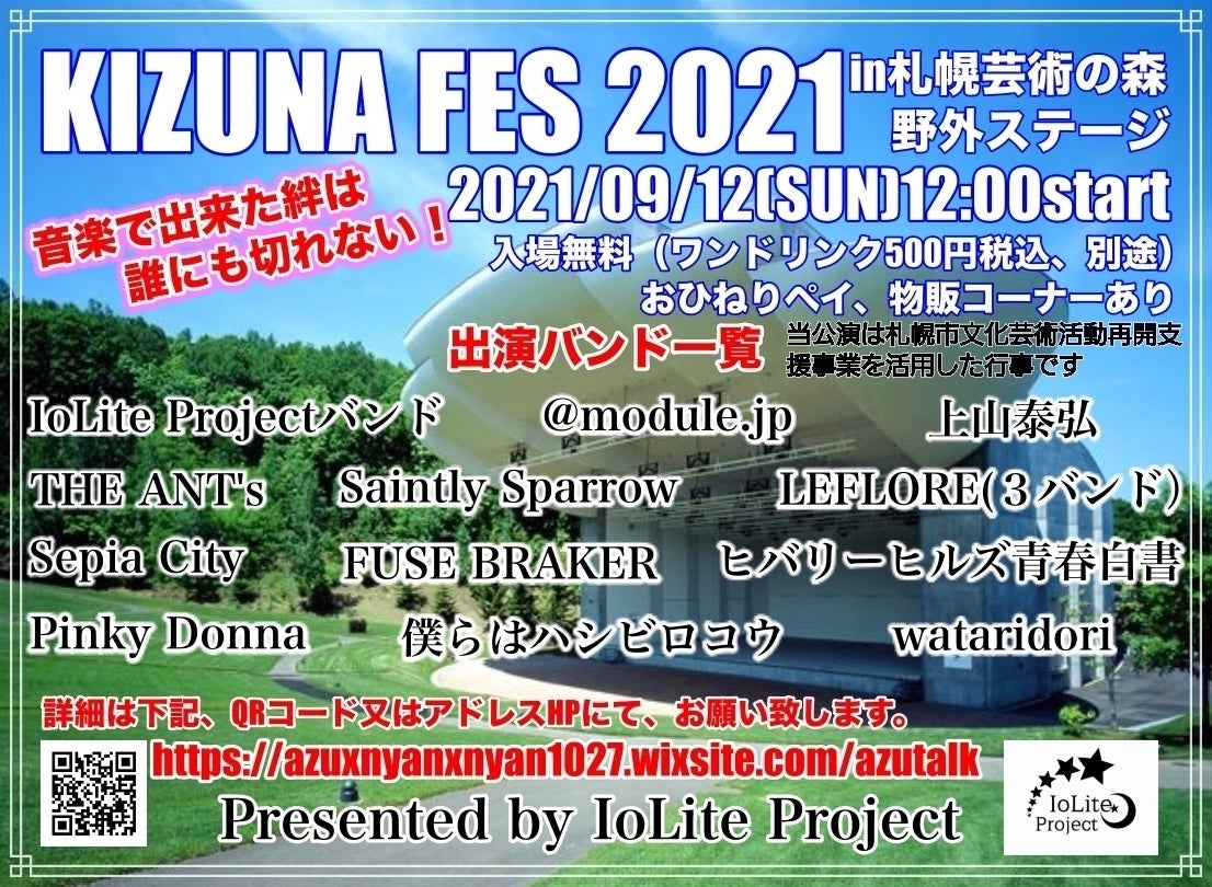 2021年9月12日、アイオライトプロジェクト初主催の野外フェスを開催し、多くの出演者様、ご来場者様にご好評頂きました。当プロジェクトは「音楽に壁はいらない」を理念に、北海道の音楽界を盛り上げるチームです。