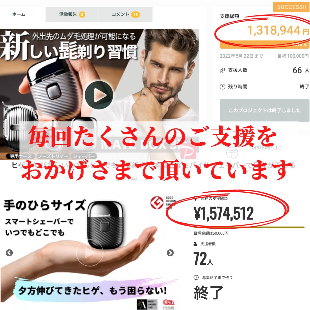 2022/10/29 22:51【ご支援者およびご興味を持ってくださる皆さまへ】【SmaSmall 】https://camp-fire.jp/projects/view/590525このプロジェクトも残り24時間となりました。プロジェクトを開始して、いろんな方に《SmaSmall》プロジェクトを応援いただいたことを嬉しく思います。SmaSmallをより多くの人に届けられるよう、最後まで頑張ります。迷っておられる方は、お得な価格SmaSmallを入手できるこの機会にどうぞご支援をよろしくお願い致します! もっと見る
