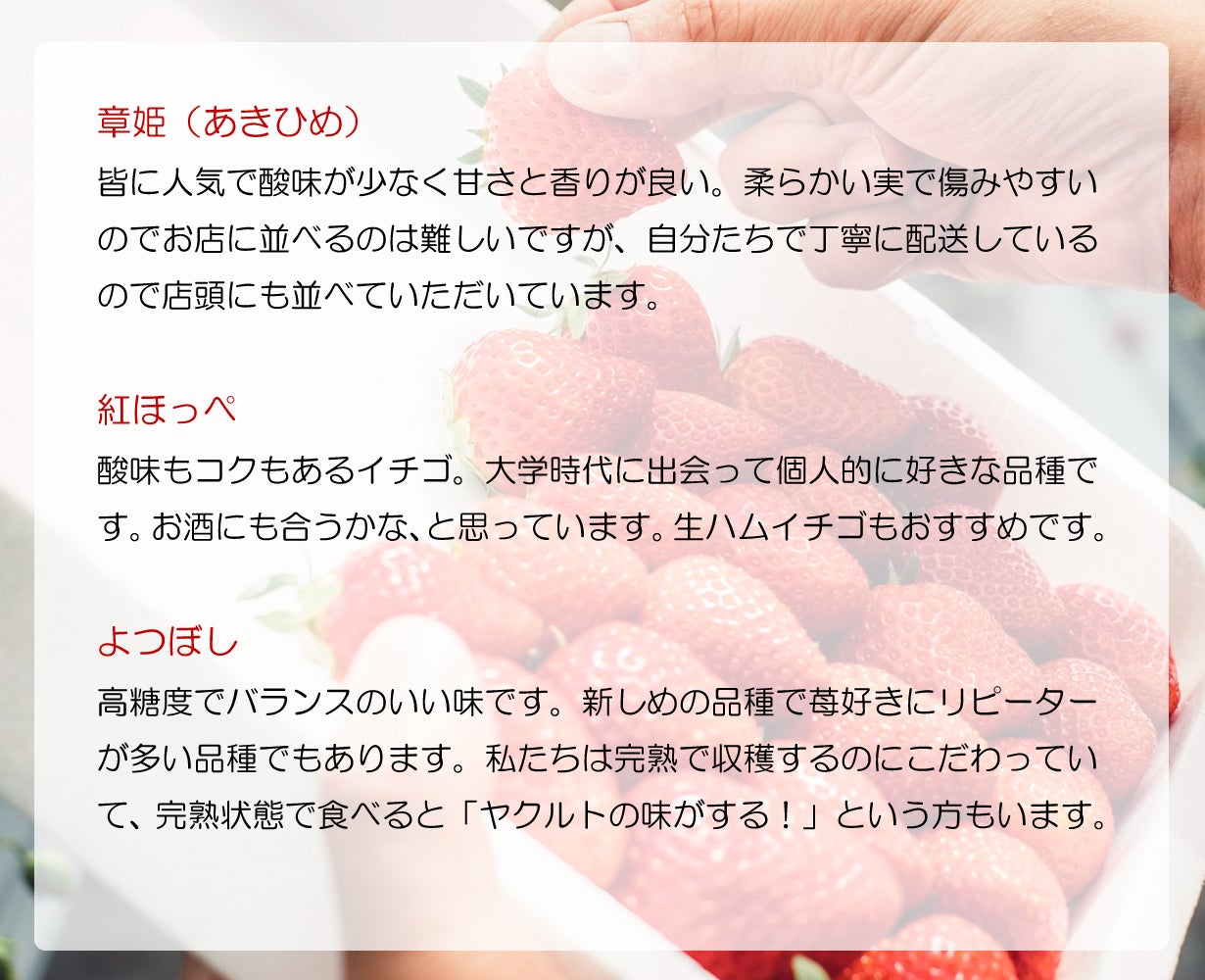 あきひめ、紅ほっぺ、よつぼしの3品種を育てています。同じハウス内で栽培しているので、ハウスでのイチゴ狩りの時には食べ比べもしていただけます。