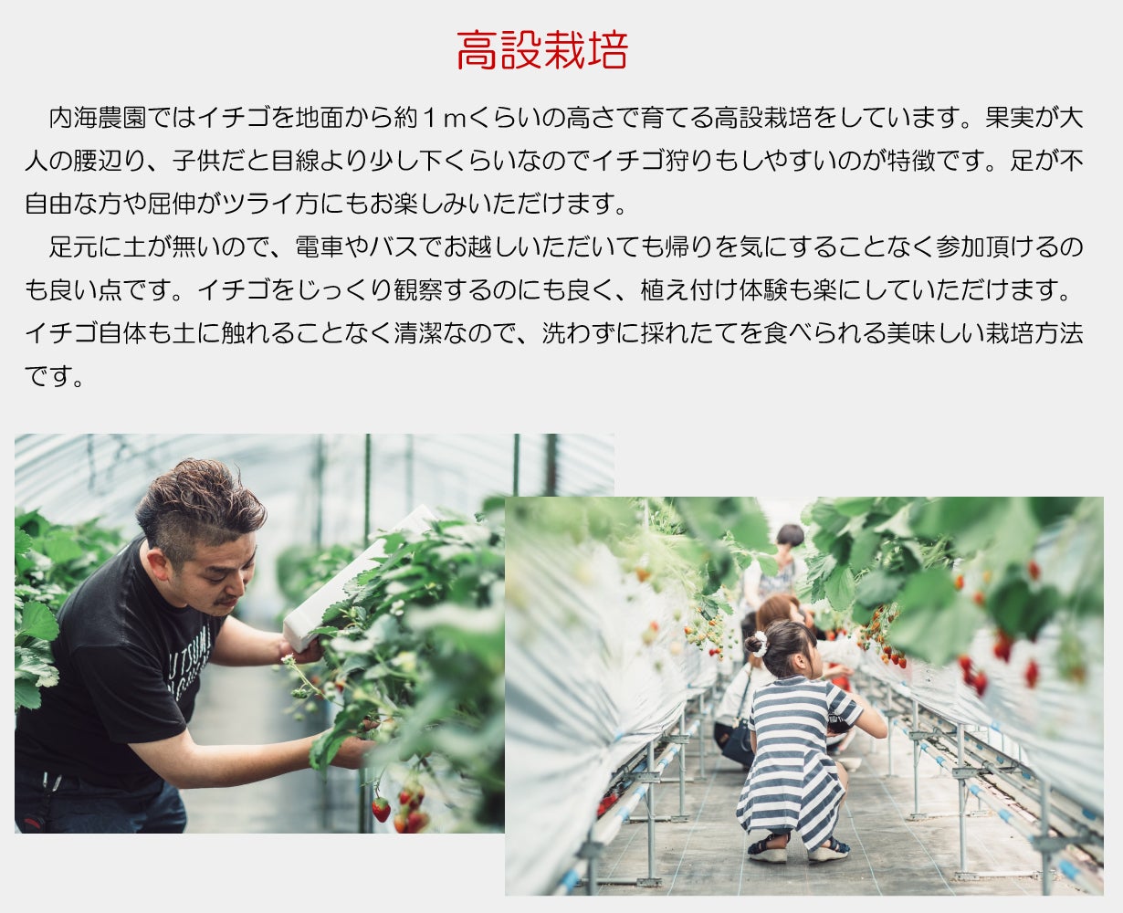 内海農園のイチゴを土ごと指定の場所までお届けし、いちご狩りを楽しんでいただけます。幼稚園や町内会、法人様のご依頼も可能です。