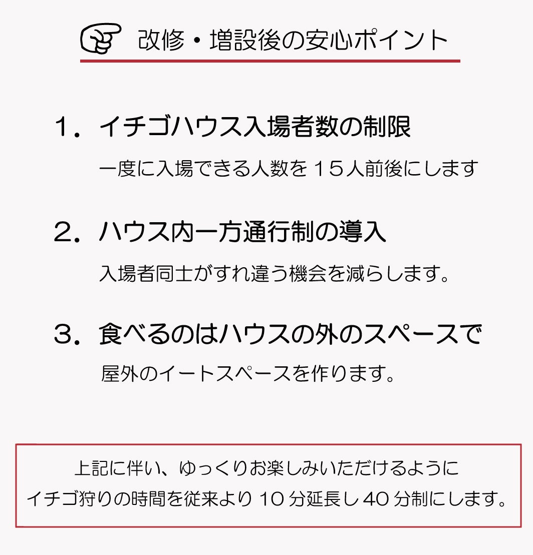 安心・安全にイチゴ狩りを楽しんでいただくために、3つのルールのもと再開したいと考えています。
