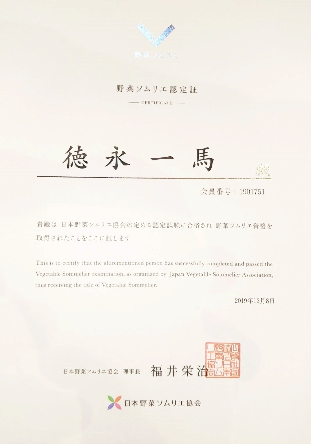 野菜ソムリエとは「野菜・果物の知識を身につけ、その魅力や価値を社会に広めることができるスペシャリスト」として一般社団法人日本野菜ソムリエ協会が認定する民間資格です。